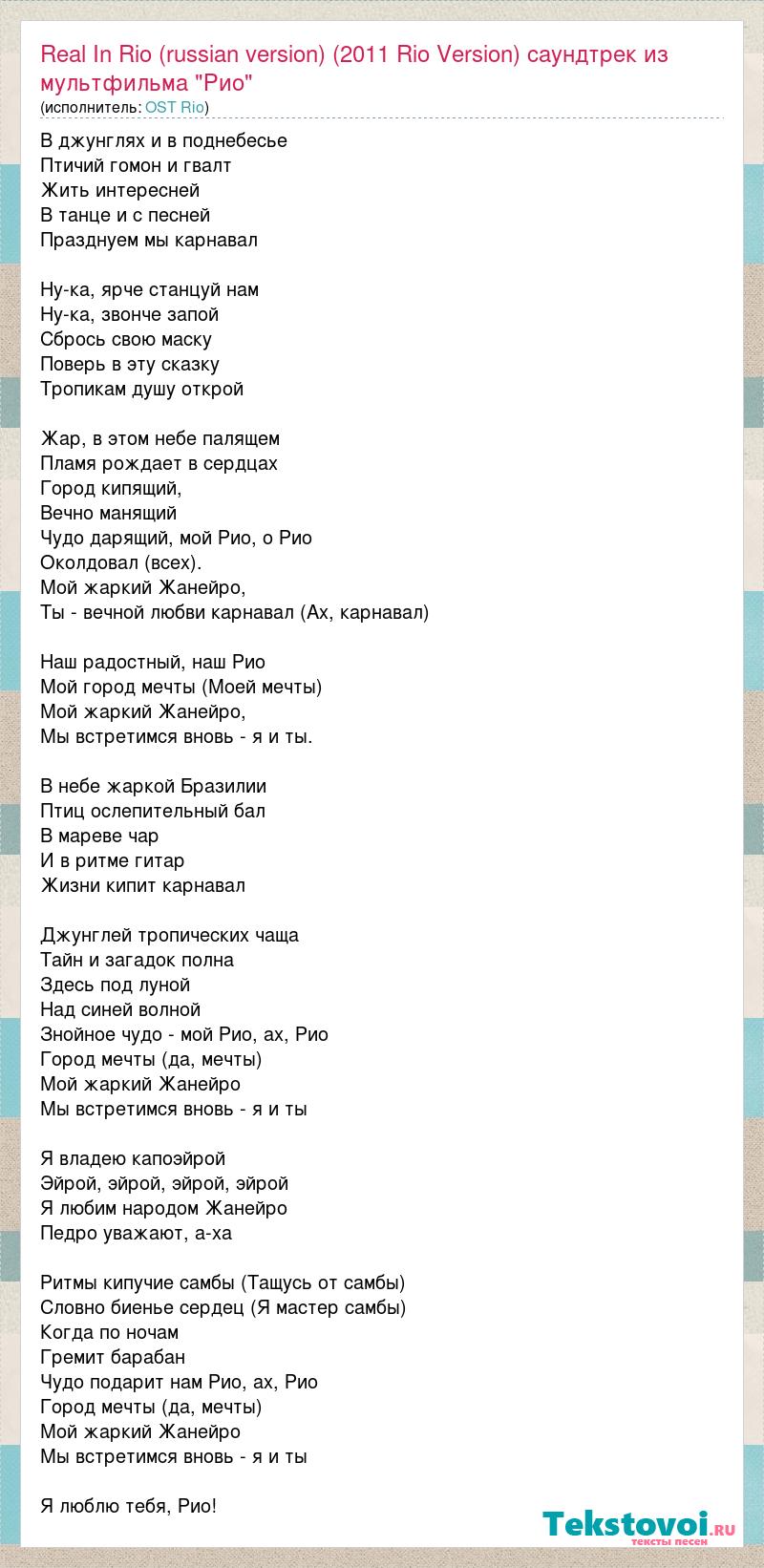 В джунглях и в поднебесье Птичий гомон и гвалт Жить интересней В танце и с песней Празднуем мы карнавал Ну-ка, ярче станцуй нам Ну-ка, звонче запой Сбрось свою маску Поверь в эту сказку Тропикам душу открой Жар, в этом небе палящем Пламя рождает в сердцах Город кипящий, Вечно манящий Чудо дарящий, мой Рио, о Рио Околдовал (всех). Мой жаркий Жанейро, Ты - вечной любви карнавал (Ах, карнавал) Наш радостный, наш Рио Мой город мечты (Моей мечты) Мой жаркий Жанейро, Мы встретимся вновь - я и ты. В небе жаркой Бразилии Птиц ослепительный бал В мареве чар И в ритме гитар Жизни кипит карнавал Джунглей тропических чаща Тайн и загадок полна Здесь под луной Над синей волной Знойное чудо - мой Рио, ах, Рио Город мечты (да, мечты) Мой жаркий Жанейро Мы встретимся вновь - я и ты Я владею капоэйрой Эйрой, эйрой, эйрой, эйрой Я любим народом Жанейро Педро уважают, а-ха Ритмы кипучие самбы (Тащусь от самбы) Словно биенье сердец (Я мастер самбы) Когда по ночам Гремит барабан Чудо подарит нам Рио, ах, Рио Город мечты (да, мечты) Мой жаркий Жанейро Мы встретимся вновь - я и ты Я люблю тебя, Рио!
