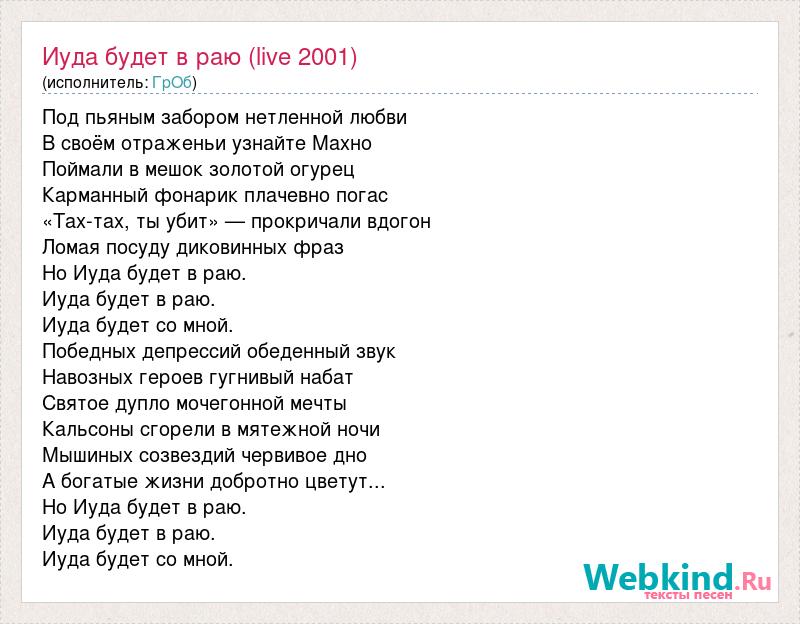 Под пьяным забором нетленной любви В своём отраженьи узнайте Махно Поймали в мешок золотой огурец Карманный фонарик плачевно погас «Тах-тах, ты убит» — прокричали вдогон Ломая посуду диковинных фраз Но Иуда будет в раю. Иуда будет в раю. Иуда будет со мной. Победных депрессий обеденный звук Навозных героев гугнивый набат Святое дупло мочегонной мечты Кальсоны сгорели в мятежной ночи Мышиных созвездий червивое дно А богатые жизни добротно цветут... Но Иуда будет в раю. Иуда будет в раю. Иуда будет со мной.
