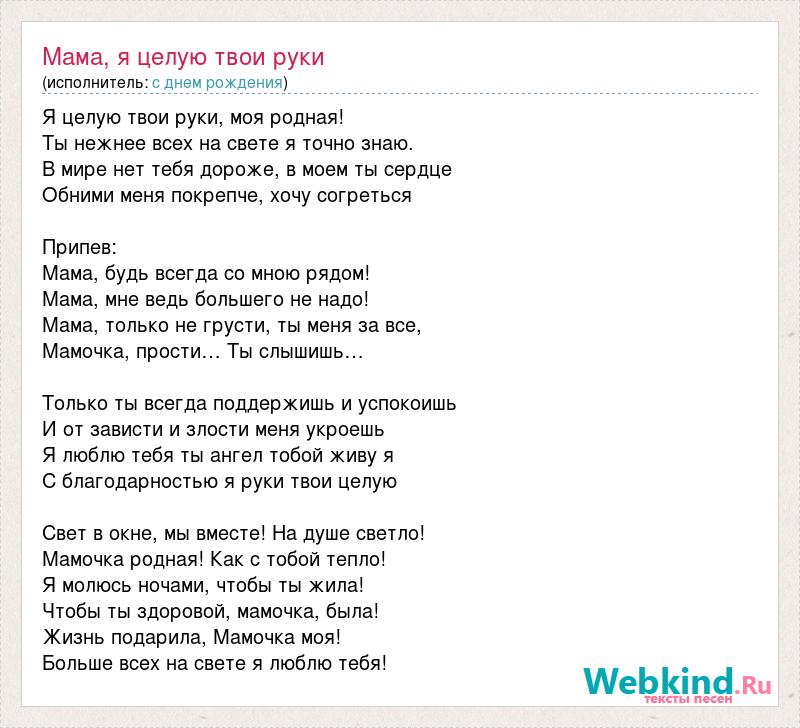 Я целую твои руки, моя родная! Ты нежнее всех на свете я точно знаю. В мире нет тебя дороже, в моем ты сердце Обними меня покрепче, хочу согреться Припев: Мама, будь всегда со мною рядом! Мама, мне ведь большего не надо! Мама, только не грусти, ты меня за все, Мамочка, прости… Ты слышишь… Только ты всегда поддержишь и успокоишь И от зависти и злости меня укроешь Я люблю тебя ты ангел тобой живу я С благодарностью я руки твои целую Свет в окне, мы вместе! На душе светло! Мамочка родная! Как с тобой тепло! Я молюсь ночами, чтобы ты жила! Чтобы ты здоровой, мамочка, была! Жизнь подарила, Мамочка моя! Больше всех на свете я люблю тебя!