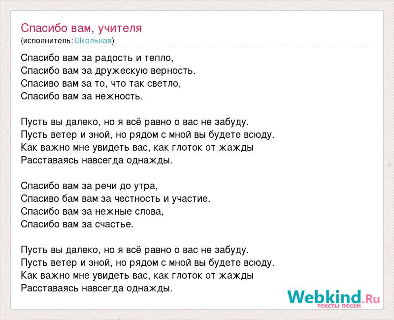 Спасибо вам за радость и тепло, Спасибо вам за дружескую верность. Спасиво вам за то, что так светло, Спасибо вам за нежность. Пусть вы далеко, но я всё равно о вас не забуду. Пусть ветер и зной, но рядом с мной вы будете всюду. Как важно мне увидеть вас, как глоток от жажды Расставаясь навсегда однажды. Спасибо вам за речи до утра, Спасиво бам вам за честность и участие. Спасибо вам за нежные слова, Спасибо вам за счастье. Пусть вы далеко, но я всё равно о вас не забуду. Пусть ветер и зной, но рядом с мной вы будете всюду. Как важно мне увидеть вас, как глоток от жажды Расставаясь навсегда однажды.