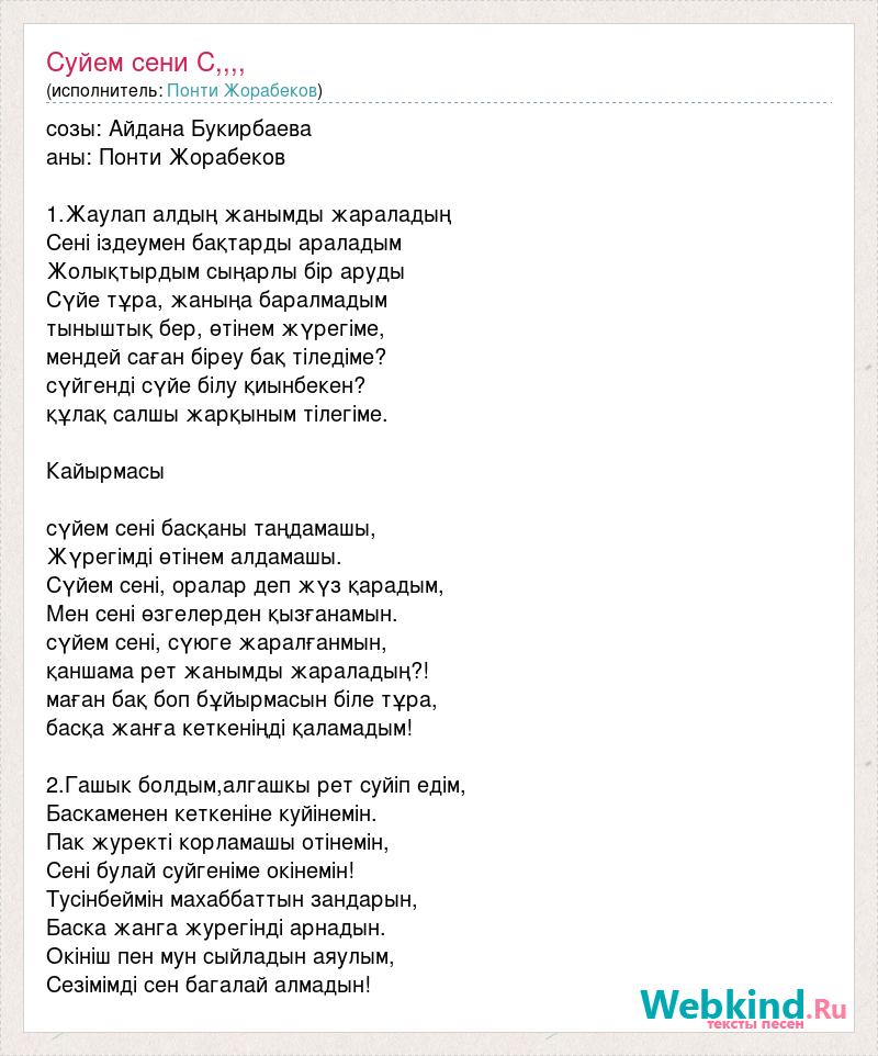 созы: Айдана Букирбаева аны: Понти Жорабеков 1.Жаулап алдың жанымды жараладың Сені іздеумен бақтарды араладым Жолықтырдым сыңарлы бір аруды Сүйе тұра, жаныңа баралмадым тыныштық бер, өтінем жүрегіме, мендей саған біреу бақ тіледіме? сүйгенді сүйе білу қиынбекен? құлақ салшы жарқыным тілегіме. Кайырмасы сүйем сені басқаны таңдамашы, Жүрегімді өтінем алдамашы. Сүйем сені, оралар деп жүз қарадым, Мен сені өзгелерден қызғанамын. сүйем сені, сүюге жаралғанмын, қаншама рет жанымды жараладың?! маған бақ боп бұйырмасын біле тұра, басқа жанға кеткеніңді қаламадым! 2.Гашык болдым,алгашкы рет суйiп едім, Баскаменен кеткенiне куйiнемін. Пак журектi корламашы отiнемін, Сенi булай суйгенiме окiнемін! Тусiнбеймiн махаббаттын зандарын, Баска жанга журегiндi арнадын. Окiнiш пен мун сыйладын аяулым, Сезiмiмдi сен багалай алмадын!