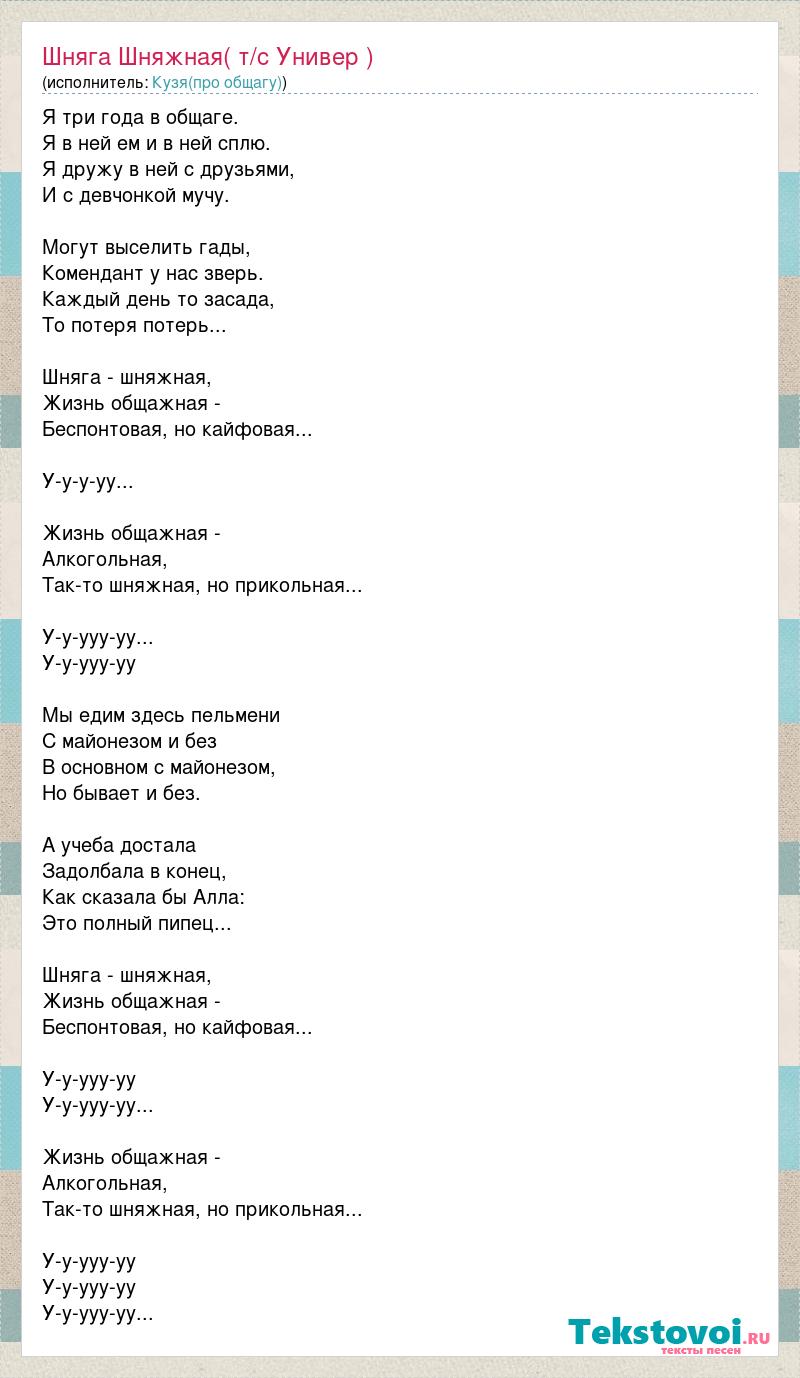 Я три года в общаге. Я в ней ем и в ней сплю. Я дружу в ней с друзьями, И с девчонкой мучу. Могут выселить гады, Комендант у нас зверь. Каждый день то засада, То потеря потерь... Шняга - шняжная, Жизнь общажная - Беспонтовая, но кайфовая... У-у-у-уу... Жизнь общажная - Алкогольная, Так-то шняжная, но прикольная... У-у-ууу-уу... У-у-ууу-уу Мы едим здесь пельмени С майонезом и без В основном с майонезом, Но бывает и без. А учеба достала Задолбала в конец, Как сказала бы Алла: Это полный пипец... Шняга - шняжная, Жизнь общажная - Беспонтовая, но кайфовая... У-у-ууу-уу У-у-ууу-уу... Жизнь общажная - Алкогольная, Так-то шняжная, но прикольная... У-у-ууу-уу У-у-ууу-уу У-у-ууу-уу...