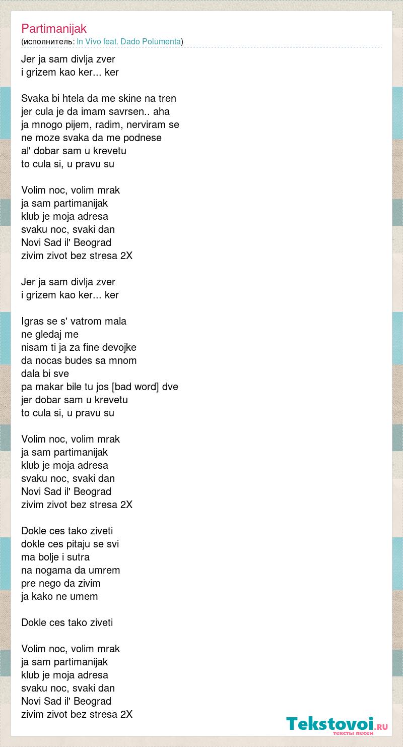 Jer ja sam divlja zver i grizem kao ker... ker Svaka bi htela da me skine na tren jer cula je da imam savrsen.. aha ja mnogo pijem, radim, nerviram se ne moze svaka da me podnese al' dobar sam u krevetu to cula si, u pravu su Volim noc, volim mrak ja sam partimanijak klub je moja adresa svaku noc, svaki dan Novi Sad il' Beograd zivim zivot bez stresa 2X Jer ja sam divlja zver i grizem kao ker... ker Igras se s' vatrom mala ne gledaj me nisam ti ja za fine devojke da nocas budes sa mnom dala bi sve pa makar bile tu jos druge dve jer dobar sam u krevetu to cula si, u pravu su Volim noc, volim mrak ja sam partimanijak klub je moja adresa svaku noc, svaki dan Novi Sad il' Beograd zivim zivot bez stresa 2X Dokle ces tako ziveti dokle ces pitaju se svi ma bolje i sutra na nogama da umrem pre nego da zivim ja kako ne umem Dokle ces tako ziveti Volim noc, volim mrak ja sam partimanijak klub je moja adresa svaku noc, svaki dan Novi Sad il' Beograd zivim zivot bez stresa 2X