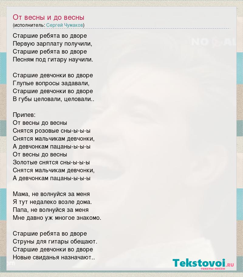 Старшие ребята во дворе Первую зарплату получили, Старшие ребята во дворе Песням под гитару научили. Старшие девчонки во дворе Глупые вопросы задавали, Старшие девчонки во дворе В губы целовали, целовали.. Припев: От весны до весны Снятся розовые сны-ы-ы-ы Снятся мальчикам девчонки, А девчонкам пацаны-ы-ы-ы От весны до весны Золотые снятся сны-ы-ы-ы Снятся мальчикам девчонки, А девчонкам пацаны-ы-ы-ы Мама, не волнуйся за меня Я тут недалеко возле дома. Папа, не волнуйся за меня Мне давно уж многое знакомо. Старшие ребята во дворе Струны для гитары обещают. Старшие девчонки во дворе Новые свиданья назначают..