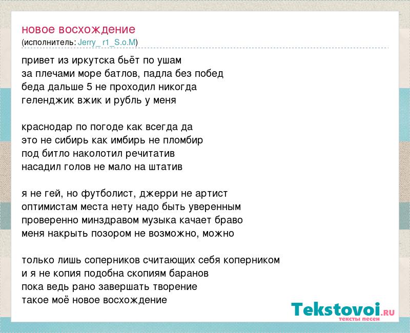 привет из иркутска бьёт по ушам за плечами море батлов, падла без побед беда дальше 5 не проходил никогда геленджик вжик и рубль у меня краснодар по погоде как всегда да это не сибирь как имбирь не пломбир под битло наколотил речитатив насадил голов не мало на штатив я не гей, но футболист, джерри не артист оптимистам места нету надо быть уверенным проверенно минздравом музыка качает браво меня накрыть позором не возможно, можно только лишь соперников считающих себя коперником и я не копия подобна скопиям баранов пока ведь рано завершать творение такое моё новое восхождение