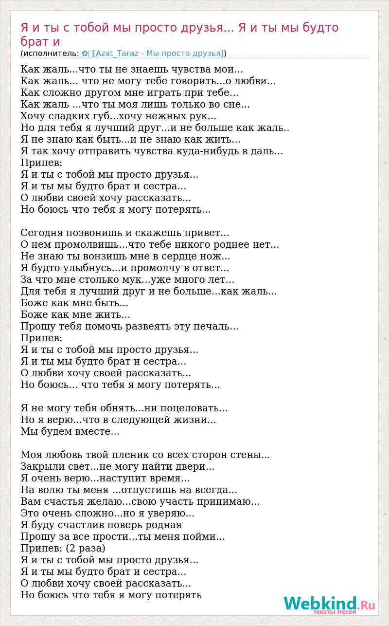 Как жаль...что ты не знаешь чувства мои... Как жаль... что не могу тебе говорить...о любви... Как сложно другом мне играть при тебе... Как жаль ...что ты моя лишь только во сне... Хочу сладких губ...хочу нежных рук... Но для тебя я лучший друг...и не больше как жаль.. Я не знаю как быть...и не знаю как жить... Я так хочу отправить чувства куда-нибудь в даль... Припев: Я и ты с тобой мы просто друзья... Я и ты мы будто брат и сестра... О любви своей хочу рассказать... Но боюсь что тебя я могу потерять... Сегодня позвонишь и скажешь привет... О нем промолвишь...что тебе никого роднее нет... Не знаю ты вонзишь мне в сердце нож... Я будто улыбнусь...и промолчу в ответ... За что мне столько мук...уже много лет... Для тебя я лучший друг и не больше...как жаль... Боже как мне быть... Боже как мне жить... Прошу тебя помочь развеять эту печаль... Припев: Я и ты с тобой мы просто друзья... Я и ты мы будто брат и сестра... О любви хочу своей рассказать... Но боюсь... что тебя я могу потерять... Я не могу тебя обнять...ни поцеловать... Но я верю...что в следующей жизни... Мы будем вместе... Моя любовь твой пленик со всех сторон стены... Закрыли свет...не могу найти двери... Я очень верю...наступит время... На волю ты меня ...отпустишь на всегда... Вам счастья желаю...свою участь принимаю... Это очень сложно...но я уверяю... Я буду счастлив поверь родная Прошу за все прости...ты меня пойми... Припев: (2 раза) Я и ты с тобой мы просто друзья... Я и ты мы будто брат и сестра... О любви хочу своей рассказать... Но боюсь что тебя я могу потерять