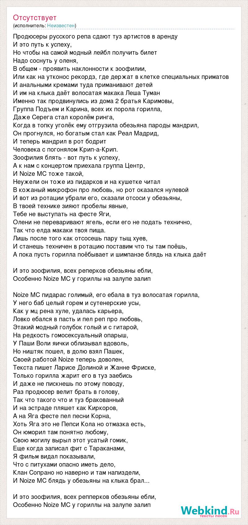 Продюсеры русского репа сдают туз артистов в аренду И это путь к успеху, Но чтобы на самой модный лейбл получить билет Надо соснуть у оленя, В общем - проявить наклонности к зоофилии, Или как на утконос рекордз, где держат в клетке специальных приматов И анальными кремами туда приманивают детей И им на клыка даёт волосатая макака Леша Туман Именно так продвинулись из дома 2 братья Каримовы, Группа Подъем и Карина, всех их порола горилла, Даже Серега стал королём ринга, Когда в топку уголёк ему отгрузила обезьяна пароды мандрил, Он прогнулся, но богатым стал как Реал Мадрид, И теперь мандрил в рот бодрит Человека с погонялом Крип-а-Крип. Зоофилия блять - вот путь к успеху, А к нам с концертом приехала группа Центр, И Noize MC тоже такой, Неужели он тоже из пидарков и на кушетке читал В кожаный микрофон про любовь, но рот оказался нулевой И вот из ротации убрали его, сказали отсоси у обезьяны, В твоей технике зияют пробелы явные, Тебе не выступать на фесте Яги, Олени не переваривают ягель, если его не подать технично, Так что елда макаки твоя пища. Лишь после того как отсосешь пару тыщ хуев, И станешь техничен в ротацию поставим что ты там поёшь, А пока пусть горилла поёбывает и шимпанзе блядь на клыка даёт И это зоофилия, всех реперков обезьяны ебли, Особенно Noize MC у гориллы на залупе залип Noize MC пидарас голимый, его ебала в туз волосатая горилла, У него баб целый горем и сутенерские усы, Как у мц рена хуле, удалась карьера, Ловко ебался в пасть и пел реп про любовь, Этакий модный голубок голый и с гитарой, На редкость гомосексуальный опарыш, У Паши Воли яички облизывал вдоволь, Но ништяк пошел, в долю взял Пашек, Своей работой Noize теперь доволен, Текста пишет Ларисе Долиной и Жанне Фриске, Только горилла жарит его в туз заебись И даже не пискнешь по этому поводу, Раз продюсер велит брать в голову, Так что такого что и туз бракованный И на эстраде пляшет как Киркоров, А на Яга фесте пел песни Корна, Хоть Яга это не Пепси Кола но отмазка есть, Он юморил там понятно любому, Свою могилу вырыл этот усатый гомик, Еще когда записал фит с Тараканами, Я фильм видал показывали, Что с питухами опасно иметь дело, Клан Сопрано но наверно и там напиздели, И Noize MC блядь у обезьяны на клыка брал... И это зоофилия, всех репперков обезьяны ебли, Особенно Noize MC у гориллы на залупе залип