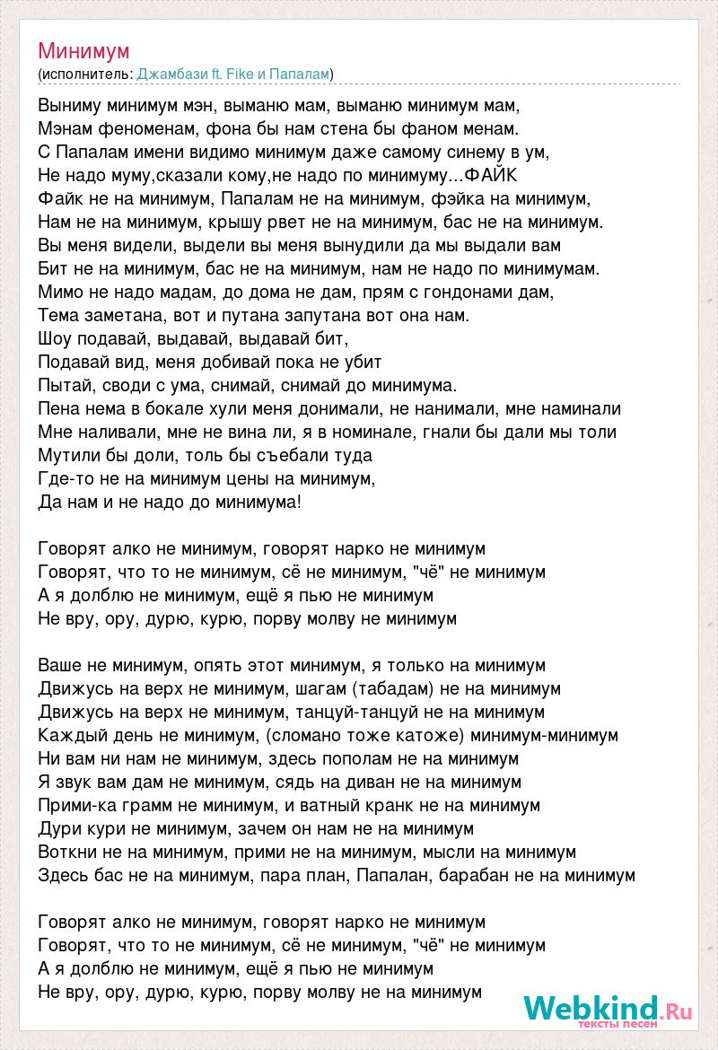 Выниму минимум мэн, выманю мам, выманю минимум мам, Мэнам феноменам, фона бы нам стена бы фаном менам. С Папалам имени видимо минимум даже самому синему в ум, Не надо муму,сказали кому,не надо по минимуму...ФАЙК Файк не на минимум, Папалам не на минимум, фэйка на минимум, Нам не на минимум, крышу рвет не на минимум, бас не на минимум. Вы меня видели, выдели вы меня вынудили да мы выдали вам Бит не на минимум, бас не на минимум, нам не надо по минимумам. Мимо не надо мадам, до дома не дам, прям с гондонами дам, Тема заметана, вот и путана запутана вот она нам. Шоу подавай, выдавай, выдавай бит, Подавай вид, меня добивай пока не убит Пытай, своди с ума, снимай, снимай до минимума. Пена нема в бокале хули меня донимали, не нанимали, мне наминали Мне наливали, мне не вина ли, я в номинале, гнали бы дали мы толи Мутили бы доли, толь бы съебали туда Где-то не на минимум цены на минимум, Да нам и не надо до минимума! Говорят алко не минимум, говорят нарко не минимум Говорят, что то не минимум, сё не минимум, "чё" не минимум А я долблю не минимум, ещё я пью не минимум Не вру, ору, дурю, курю, порву молву не минимум Ваше не минимум, опять этот минимум, я только на минимум Движусь на верх не минимум, шагам (табадам) не на минимум Движусь на верх не минимум, танцуй-танцуй не на минимум Каждый день не минимум, (сломано тоже катоже) минимум-минимум Ни вам ни нам не минимум, здесь пополам не на минимум Я звук вам дам не минимум, сядь на диван не на минимум Прими-ка грамм не минимум, и ватный кранк не на минимум Дури кури не минимум, зачем он нам не на минимум Воткни не на минимум, прими не на минимум, мысли на минимум Здесь бас не на минимум, пара план, Папалан, барабан не на минимум Говорят алко не минимум, говорят нарко не минимум Говорят, что то не минимум, сё не минимум, "чё" не минимум А я долблю не минимум, ещё я пью не минимум Не вру, ору, дурю, курю, порву молву не на минимум
