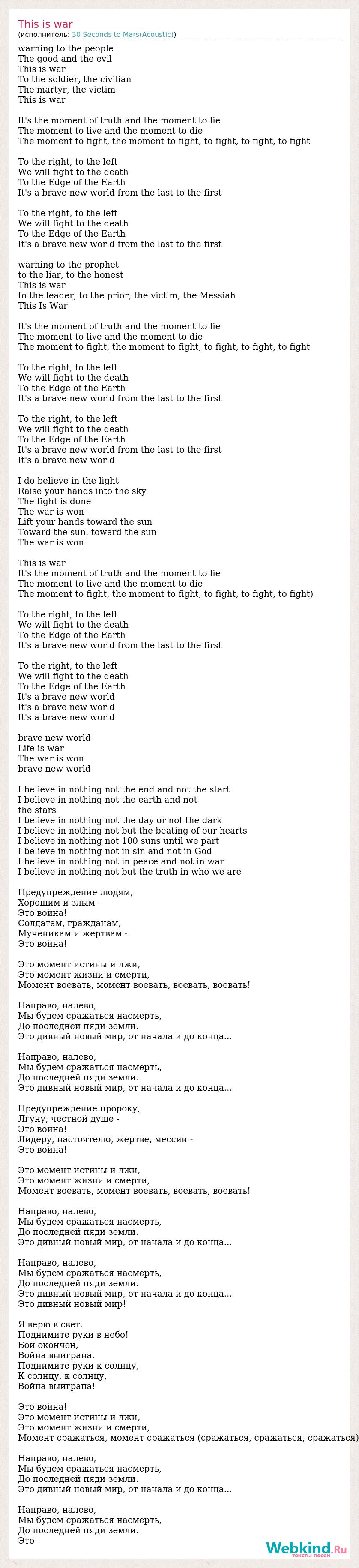 warning to the people The good and the evil This is war To the soldier, the civilian The martyr, the victim This is war It's the moment of truth and the moment to lie The moment to live and the moment to die The moment to fight, the moment to fight, to fight, to fight, to fight To the right, to the left We will fight to the death To the Edge of the Earth It's a brave new world from the last to the first To the right, to the left We will fight to the death To the Edge of the Earth It's a brave new world from the last to the first warning to the prophet to the liar, to the honest This is war to the leader, to the prior, the victim, the Messiah This Is War It's the moment of truth and the moment to lie The moment to live and the moment to die The moment to fight, the moment to fight, to fight, to fight, to fight To the right, to the left We will fight to the death To the Edge of the Earth It's a brave new world from the last to the first To the right, to the left We will fight to the death To the Edge of the Earth It's a brave new world from the last to the first It's a brave new world I do believe in the light Raise your hands into the sky The fight is done The war is won Lift your hands toward the sun Toward the sun, toward the sun The war is won This is war It's the moment of truth and the moment to lie The moment to live and the moment to die The moment to fight, the moment to fight, to fight, to fight, to fight) To the right, to the left We will fight to the death To the Edge of the Earth It's a brave new world from the last to the first To the right, to the left We will fight to the death To the Edge of the Earth It's a brave new world It's a brave new world It's a brave new world brave new world Life is war The war is won brave new world I believe in nothing not the end and not the start I believe in nothing not the earth and not the stars I believe in nothing not the day or not the dark I believe in nothing not but the beating of our hearts I believe in nothing not 100 suns until we part I believe in nothing not in sin and not in God I believe in nothing not in peace and not in war I believe in nothing not but the truth in who we are Предупреждение людям, Хорошим и злым - Это война! Солдатам, гражданам, Мученикам и жертвам - Это война! Это момент истины и лжи, Это момент жизни и смерти, Момент воевать, момент воевать, воевать, воевать! Направо, налево, Мы будем сражаться насмерть, До последней пяди земли. Это дивный новый мир, от начала и до конца... Направо, налево, Мы будем сражаться насмерть, До последней пяди земли. Это дивный новый мир, от начала и до конца... Предупреждение пророку, Лгуну, честной душе - Это война! Лидеру, настоятелю, жертве, мессии - Это война! Это момент истины и лжи, Это момент жизни и смерти, Момент воевать, момент воевать, воевать, воевать! Направо, налево, Мы будем сражаться насмерть, До последней пяди земли. Это дивный новый мир, от начала и до конца... Направо, налево, Мы будем сражаться насмерть, До последней пяди земли. Это дивный новый мир, от начала и до конца... Это дивный новый мир! Я верю в свет. Поднимите руки в небо! Бой окончен, Война выиграна. Поднимите руки к солнцу, К солнцу, к солнцу, Война выиграна! Это война! Это момент истины и лжи, Это момент жизни и смерти, Момент сражаться, момент сражаться (сражаться, сражаться, сражаться) Направо, налево, Мы будем сражаться насмерть, До последней пяди земли. Это дивный новый мир, от начала и до конца... Направо, налево, Мы будем сражаться насмерть, До последней пяди земли. Это