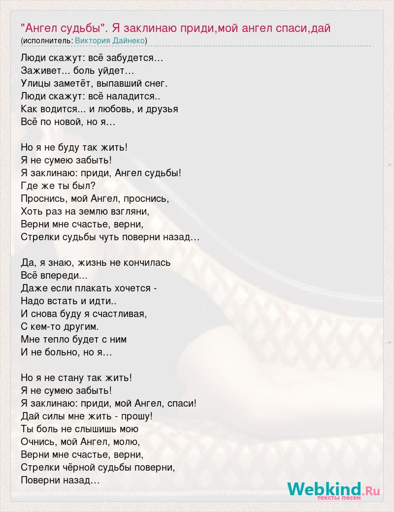 Люди скажут: всё забудется… Заживет... боль уйдет… Улицы заметёт, выпавший снег. Люди скажут: всё наладится.. Как водится... и любовь, и друзья Всё по новой, но я… Но я не буду так жить! Я не сумею забыть! Я заклинаю: приди, Ангел судьбы! Где же ты был? Проснись, мой Ангел, проснись, Хоть раз на землю взгляни, Верни мне счастье, верни, Стрелки судьбы чуть поверни назад… Да, я знаю, жизнь не кончилась Всё впереди... Даже если плакать хочется - Надо встать и идти.. И снова буду я счастливая, С кем-то другим. Мне тепло будет с ним И не больно, но я… Но я не стану так жить! Я не сумею забыть! Я заклинаю: приди, мой Ангел, спаси! Дай силы мне жить - прошу! Ты боль не слышишь мою Очнись, мой Ангел, молю, Верни мне счастье, верни, Стрелки чёрной судьбы поверни, Поверни назад…