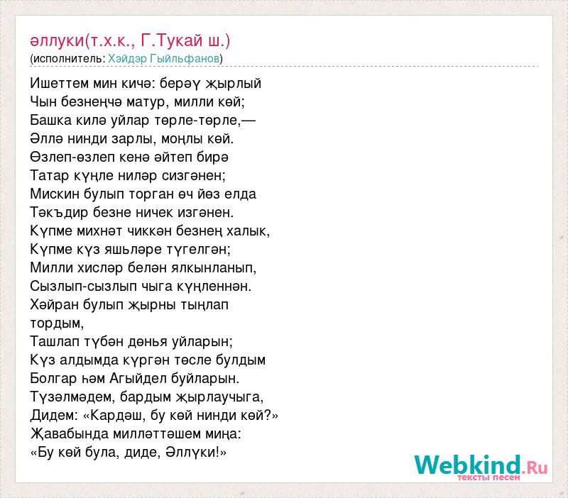 Ишеттем мин кичә: берәү җырлый Чын безнеңчә матур, милли көй; Башка килә уйлар төрле-төрле,— Әллә нинди зарлы, моңлы көй. Өзлеп-өзлеп кенә әйтеп бирә Татар күңле ниләр сизгәнен; Мискин булып торган өч йөз елда Тәкъдир безне ничек изгәнен. Күпме михнәт чиккән безнең халык, Күпме күз яшьләре түгелгән; Милли хисләр белән ялкынланып, Сызлып-сызлып чыга күңленнән. Хәйран булып җырны тыңлап тордым, Ташлап түбән дөнья уйларын; Күз алдымда күргән төсле булдым Болгар һәм Агыйдел буйларын. Түзәлмәдем, бардым җырлаучыга, Дидем: «Кардәш, бу көй нинди көй?» Җавабында милләттәшем миңа: «Бу көй була, диде, Әллүки!»