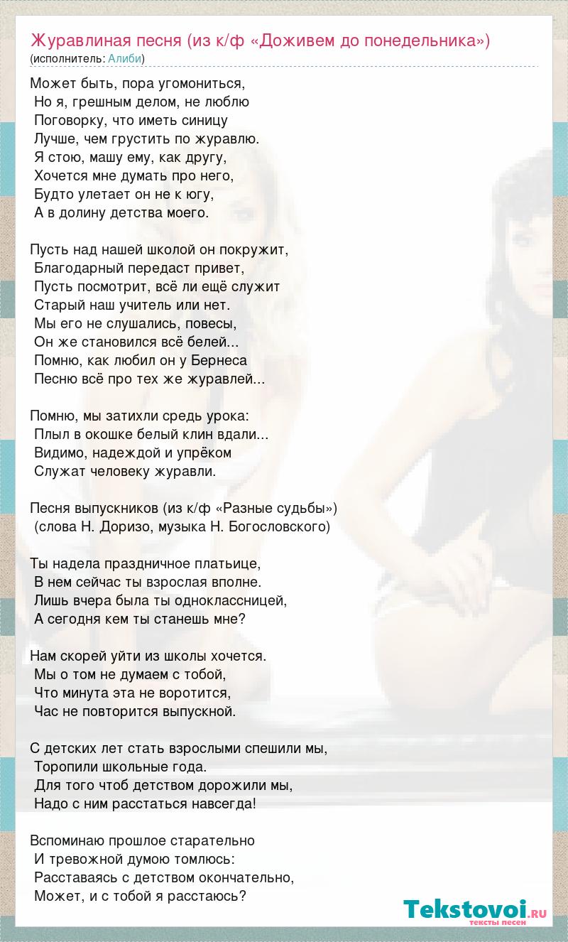 Может быть, пора угомониться, Но я, грешным делом, не люблю Поговорку, что иметь синицу Лучше, чем грустить по журавлю. Я стою, машу ему, как другу, Хочется мне думать про него, Будто улетает он не к югу, А в долину детства моего. Пусть над нашей школой он покружит, Благодарный передаст привет, Пусть посмотрит, всё ли ещё служит Старый наш учитель или нет. Мы его не слушались, повесы, Он же становился всё белей... Помню, как любил он у Бернеса Песню всё про тех же журавлей... Помню, мы затихли средь урока: Плыл в окошке белый клин вдали... Видимо, надеждой и упрёком Служат человеку журавли. Песня выпускников (из к/ф «Разные судьбы») (слова Н. Доризо, музыка Н. Богословского) Ты надела праздничное платьице, В нем сейчас ты взрослая вполне. Лишь вчера была ты одноклассницей, А сегодня кем ты станешь мне? Нам скорей уйти из школы хочется. Мы о том не думаем с тобой, Что минута эта не воротится, Час не повторится выпускной. С детских лет стать взрослыми спешили мы, Торопили школьные года. Для того чтоб детством дорожили мы, Надо с ним расстаться навсегда! Вспоминаю прошлое старательно И тревожной думою томлюсь: Расставаясь с детством окончательно, Может, и с тобой я расстаюсь?