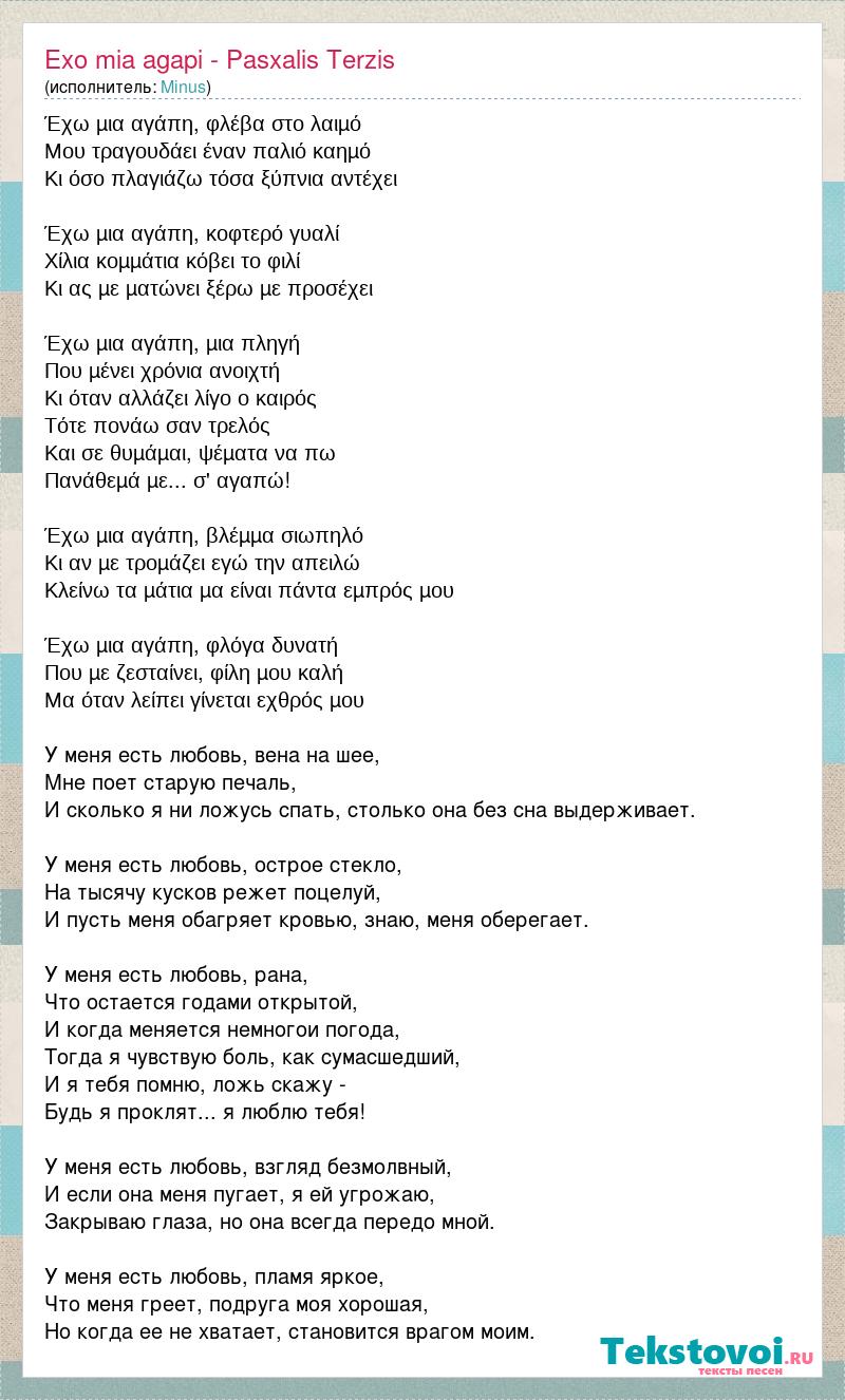Έχω μια αγάπη, φλέβα στο λαιμό Μου τραγουδάει έναν παλιό καημό Κι όσο πλαγιάζω τόσα ξύπνια αντέχει Έχω μια αγάπη, κοφτερό γυαλί Χίλια κομμάτια κόβει το φιλί Κι ας με ματώνει ξέρω με προσέχει Έχω μια αγάπη, μια πληγή Που μένει χρόνια ανοιχτή Κι όταν αλλάζει λίγο ο καιρός Τότε πονάω σαν τρελός Και σε θυμάμαι, ψέματα να πω Πανάθεμά με... σ' αγαπώ! Έχω μια αγάπη, βλέμμα σιωπηλό Κι αν με τρομάζει εγώ την απειλώ Κλείνω τα μάτια μα είναι πάντα εμπρός μου Έχω μια αγάπη, φλόγα δυνατή Που με ζεσταίνει, φίλη μου καλή Μα όταν λείπει γίνεται εχθρός μου У меня есть любовь, вена на шее, Мне поет старую печаль, И сколько я ни ложусь спать, столько она без сна выдерживает. У меня есть любовь, острое стекло, На тысячу кусков режет поцелуй, И пусть меня обагряет кровью, знаю, меня оберегает. У меня есть любовь, рана, Что остается годами открытой, И когда меняется немногои погода, Тогда я чувствую боль, как сумасшедший, И я тебя помню, ложь скажу - Будь я проклят... я люблю тебя! У меня есть любовь, взгляд безмолвный, И если она меня пугает, я ей угрожаю, Закрываю глаза, но она всегда передо мной. У меня есть любовь, пламя яркое, Что меня греет, подруга моя хорошая, Но когда ее не хватает, становится врагом моим.
