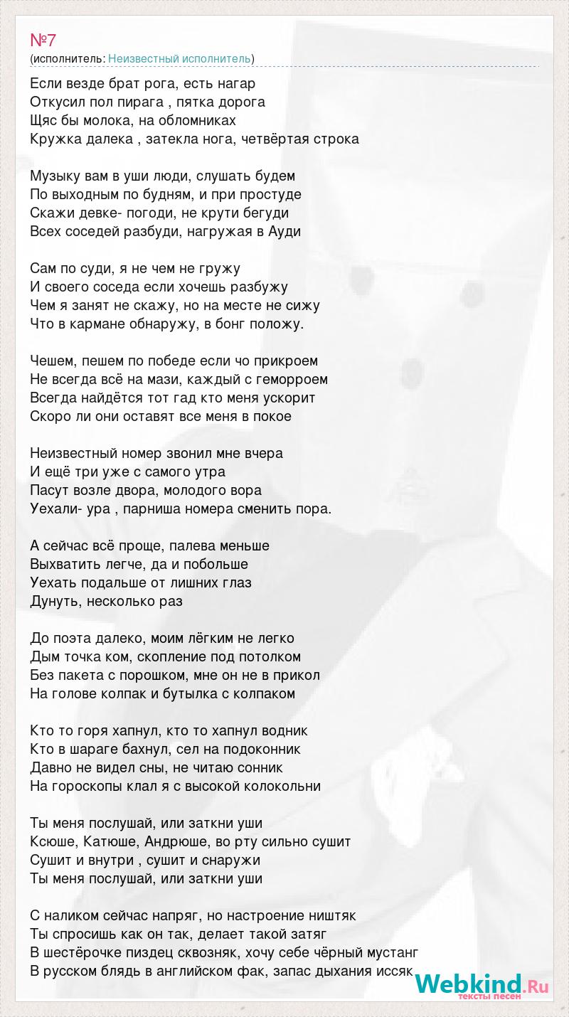 Если везде брат рога, есть нагар Откусил пол пирага , пятка дорога Щяс бы молока, на обломниках Кружка далека , затекла нога, четвёртая строка Музыку вам в уши люди, слушать будем По выходным по будням, и при простуде Скажи девке- погоди, не крути бегуди Всех соседей разбуди, нагружая в Ауди Сам по суди, я не чем не гружу И своего соседа если хочешь разбужу Чем я занят не скажу, но на месте не сижу Что в кармане обнаружу, в бонг положу. Чешем, пешем по победе если чо прикроем Не всегда всё на мази, каждый с геморроем Всегда найдётся тот гад кто меня ускорит Скоро ли они оставят все меня в покое Неизвестный номер звонил мне вчера И ещё три уже с самого утра Пасут возле двора, молодого вора Уехали- ура , парниша номера сменить пора. А сейчас всё проще, палева меньше Выхватить легче, да и побольше Уехать подальше от лишних глаз Дунуть, несколько раз До поэта далеко, моим лёгким не легко Дым точка ком, скопление под потолком Без пакета с порошком, мне он не в прикол На голове колпак и бутылка с колпаком Кто то горя хапнул, кто то хапнул водник Кто в шараге бахнул, сел на подоконник Давно не видел сны, не читаю сонник На гороскопы клал я с высокой колокольни Ты меня послушай, или заткни уши Ксюше, Катюше, Андрюше, во рту сильно сушит Сушит и внутри , сушит и снаружи Ты меня послушай, или заткни уши С наликом сейчас напряг, но настроение ништяк Ты спросишь как он так, делает такой затяг В шестёрочке пиздец сквозняк, хочу себе чёрный мустанг В русском блядь в английском фак, запас дыхания иссяк