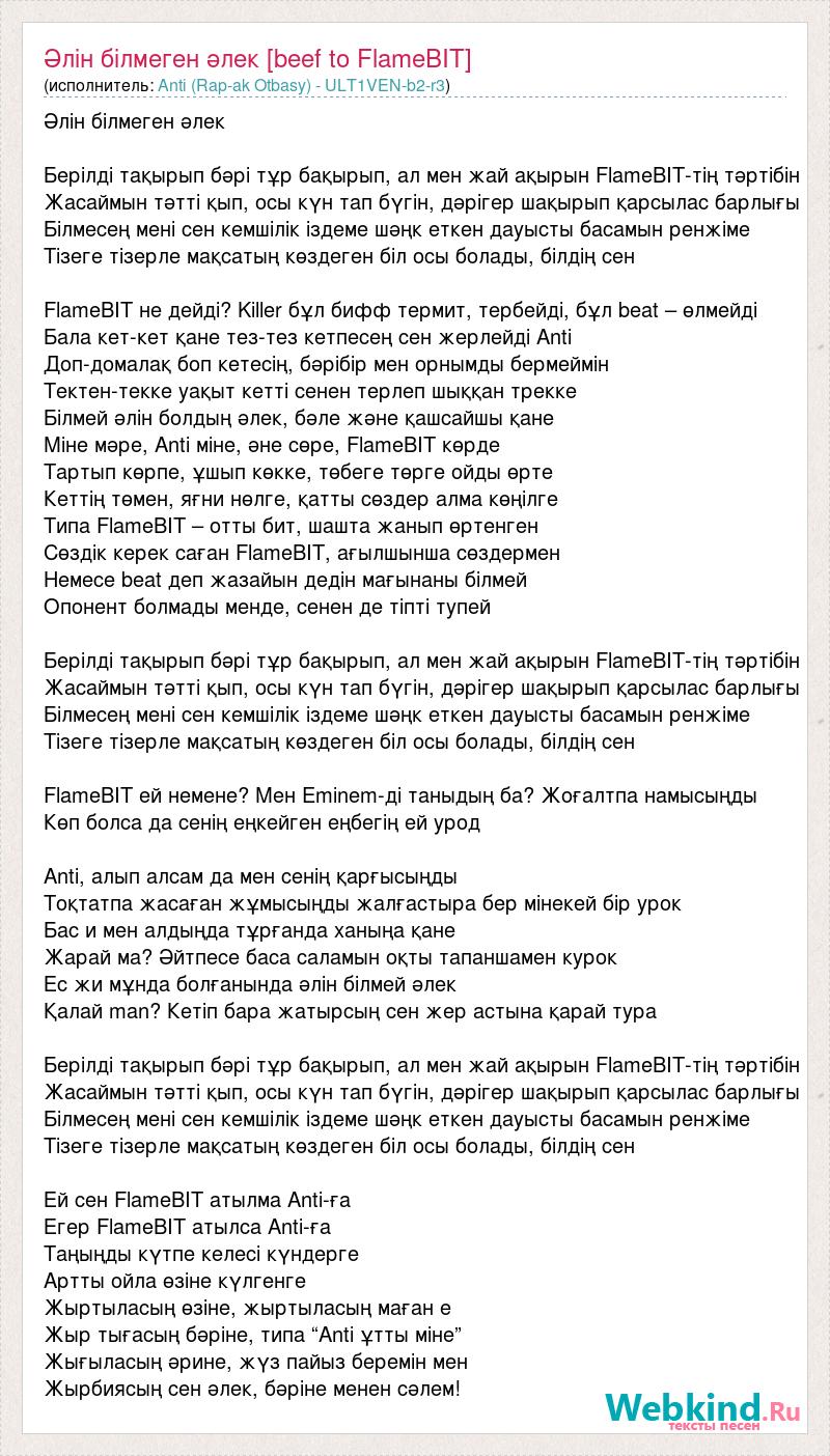 Әлін білмеген әлек Берілді тақырып бәрі тұр бақырып, ал мен жай ақырын FlameBIT-тің тәртібін Жасаймын тәтті қып, осы күн тап бүгін, дәрігер шақырып қарсылас барлығы Білмесең мені сен кемшілік іздеме шәңк еткен дауысты басамын ренжіме Тізеге тізерле мақсатың көздеген біл осы болады, білдің сен FlameBIT не дейді? Killer бұл бифф термит, тербейді, бұл beat – өлмейді Бала кет-кет қане тез-тез кетпесең сен жерлейді Anti Доп-домалақ боп кетесің, бәрібір мен орнымды бермеймін Тектен-текке уақыт кетті сенен терлеп шыққан трекке Білмей әлін болдың әлек, бәле және қашсайшы қане Міне мәре, Anti міне, әне сөре, FlameBIT көрде Тартып көрпе, ұшып көкке, төбеге төрге ойды өрте Кеттің төмен, яғни нөлге, қатты сөздер алма көңілге Типа FlameBIT – отты бит, шашта жанып өртенген Сөздік керек саған FlameBIT, ағылшынша сөздермен Немесе beat деп жазайын дедін мағынаны білмей Опонент болмады менде, сенен де тіпті тупей Берілді тақырып бәрі тұр бақырып, ал мен жай ақырын FlameBIT-тің тәртібін Жасаймын тәтті қып, осы күн тап бүгін, дәрігер шақырып қарсылас барлығы Білмесең мені сен кемшілік іздеме шәңк еткен дауысты басамын ренжіме Тізеге тізерле мақсатың көздеген біл осы болады, білдің сен FlameBIT ей немене? Мен Eminem-ді таныдың ба? Жоғалтпа намысыңды Көп болса да сенің еңкейген еңбегің ей урод Anti, алып алсам да мен сенің қарғысыңды Тоқтатпа жасаған жұмысыңды жалғастыра бер мінекей бір урок Бас и мен алдыңда тұрғанда ханыңа қане Жарай ма? Әйтпесе баса саламын оқты тапаншамен курок Ес жи мұнда болғанында әлін білмей әлек Қалай man? Кетіп бара жатырсың сен жер астына қарай тура Берілді тақырып бәрі тұр бақырып, ал мен жай ақырын FlameBIT-тің тәртібін Жасаймын тәтті қып, осы күн тап бүгін, дәрігер шақырып қарсылас барлығы Білмесең мені сен кемшілік іздеме шәңк еткен дауысты басамын ренжіме Тізеге тізерле мақсатың көздеген біл осы болады, білдің сен Ей сен FlameBIT атылма Anti-ға Егер FlameBIT атылса Anti-ға Таңыңды күтпе келесі күндерге Артты ойла өзіне күлгенге Жыртыласың өзіне, жыртыласың маған е Жыр тығасың бәріне, типа “Anti ұтты міне” Жығыласың әрине, жүз пайыз беремін мен Жырбиясың сен әлек, бәріне менен сәлем!