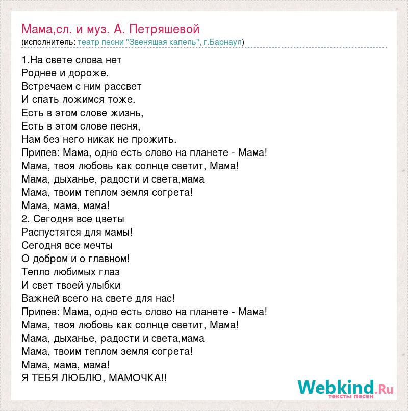1.На свете слова нет Роднее и дороже. Встречаем с ним рассвет И спать ложимся тоже. Есть в этом слове жизнь, Есть в этом слове песня, Нам без него никак не прожить. Припев: Мама, одно есть слово на планете - Мама! Мама, твоя любовь как солнце светит, Мама! Мама, дыханье, радости и света,мама Мама, твоим теплом земля согрета! Мама, мама, мама! 2. Сегодня все цветы Распустятся для мамы! Сегодня все мечты О добром и о главном! Тепло любимых глаз И свет твоей улыбки Важней всего на свете для нас! Припев: Мама, одно есть слово на планете - Мама! Мама, твоя любовь как солнце светит, Мама! Мама, дыханье, радости и света,мама Мама, твоим теплом земля согрета! Мама, мама, мама! Я ТЕБЯ ЛЮБЛЮ, МАМОЧКА!!