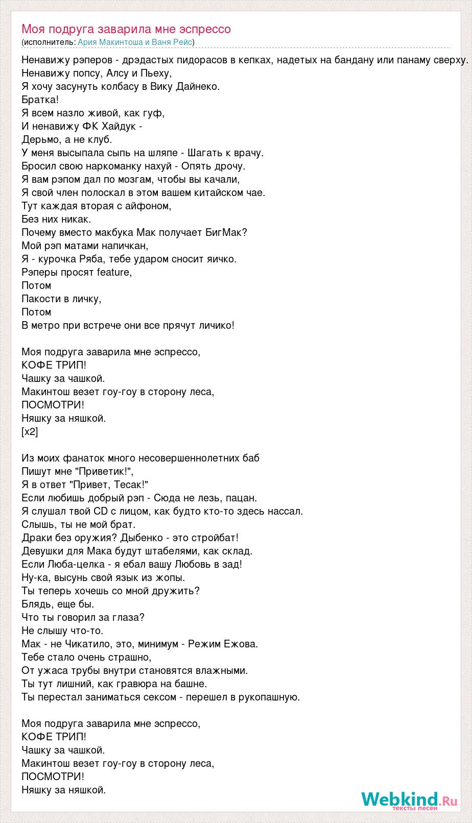Ненавижу рэперов - дрэдастых пидорасов в кепках, надетых на бандану или панаму сверху. Ненавижу попсу, Алсу и Пьеху, Я хочу засунуть колбасу в Вику Дайнеко. Братка! Я всем назло живой, как гуф, И ненавижу ФК Хайдук - Дерьмо, а не клуб. У меня высыпала сыпь на шляпе - Шагать к врачу. Бросил свою наркоманку нахуй - Опять дрочу. Я вам рэпом дал по мозгам, чтобы вы качали, Я свой член полоскал в этом вашем китайском чае. Тут каждая вторая с айфоном, Без них никак. Почему вместо макбука Мак получает БигМак? Мой рэп матами напичкан, Я - курочка Ряба, тебе ударом сносит яичко. Рэперы просят feature, Потом Пакости в личку, Потом В метро при встрече они все прячут личико! Моя подруга заварила мне эспрессо, КОФЕ ТРИП! Чашку за чашкой. Макинтош везет гоу-гоу в сторону леса, ПОСМОТРИ! Няшку за няшкой. [х2] Из моих фанаток много несовершеннолетних баб Пишут мне "Приветик!", Я в ответ "Привет, Тесак!" Если любишь добрый рэп - Сюда не лезь, пацан. Я слушал твой CD с лицом, как будто кто-то здесь нассал. Слышь, ты не мой брат. Драки без оружия? Дыбенко - это стройбат! Девушки для Мака будут штабелями, как склад. Если Люба-целка - я ебал вашу Любовь в зад! Ну-ка, высунь свой язык из жопы. Ты теперь хочешь со мной дружить? Блядь, еще бы. Что ты говорил за глаза? Не слышу что-то. Мак - не Чикатило, это, минимум - Режим Ежова. Тебе стало очень страшно, От ужаса трубы внутри становятся влажными. Ты тут лишний, как гравюра на башне. Ты перестал заниматься сексом - перешел в рукопашную. Моя подруга заварила мне эспрессо, КОФЕ ТРИП! Чашку за чашкой. Макинтош везет гоу-гоу в сторону леса, ПОСМОТРИ! Няшку за няшкой.