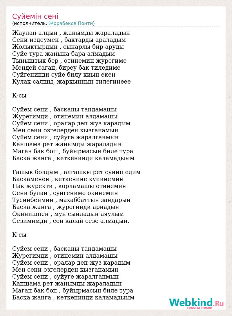 Жаулап алдын , жанымды жараладын Сени издеумен , бактарды араладым Жолыктырдын , сынарлы бир аруды Суйе тура жанына бара алмадым Тыныштык бер , отинемин журегиме Мендей саган, биреу бак тиледиме Суйгенинди суйе билу киын екен Кулак салшы, жаркыннын тилегинеее К-сы Суйем сени , басканы тандамашы Журегимди , отинемин алдамашы Суйем сени , оралар деп жуз карадым Мен сени озгелерден кызганамын Суйем сени , суйуге жаралганмын Каншама рет жанымды жараладын Маган бак боп , буйырмасын биле тура Баска жанга , кеткенинди каламадыым Гашык болдым , алгашкы рет суйип едим Баскаменен , кеткенине куйинемин Пак журекти , корламашы отинемин Сени булай , суйгениме окинемин Тусинбеймин , махаббаттын зандарын Баска жанга , журегинди арнадын Окинишпен , мун сыйладын аяулым Сезимимди , сен калай сезе алмадын. К-сы Суйем сени , басканы тандамашы Журегимди , отинемин алдамашы Суйем сени , оралар деп жуз карадым Мен сени озгелерден кызганамын Суйем сени , суйуге жаралганмын Каншама рет жанымды жараладын Маган бак боп , буйырмасын биле тура Баска жанга , кеткенинди каламадыым