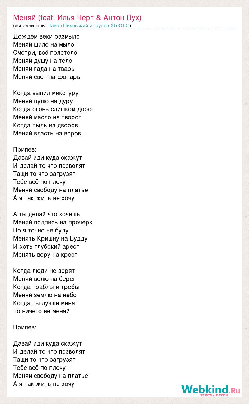 Дождём веки размыло Меняй шило на мыло Смотри, всё полетело Меняй душу на тело Меняй гада на тварь Меняй свет на фонарь Когда выпил микстуру Меняй пулю на дуру Когда огонь слишком дорог Меняй масло на творог Когда пыль из дворов Меняй власть на воров Припев: Давай иди куда скажут И делай то что позволят Тащи то что загрузят Тебе всё по плечу Меняй свободу на платье А я так жить не хочу А ты делай что хочешь Меняй подпись на прочерк Но я точно не буду Менять Кришну на Будду И хоть глубокий арест Менять веру на крест Когда люди не верят Меняй волю на берег Когда траблы и требы Меняй землю на небо Когда ты лучше меня То ничего не меняй Припев: Давай иди куда скажут И делай то что позволят Тащи то что загрузят Тебе всё по плечу Меняй свободу на платье А я так жить не хочу