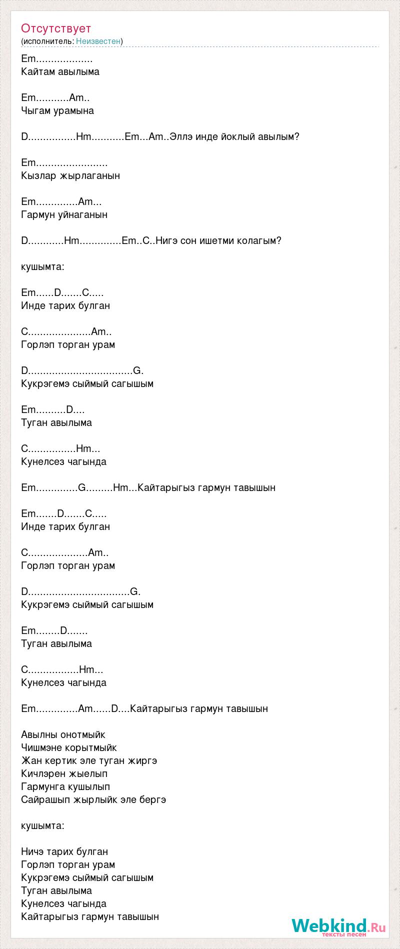 Em................... Кайтам авылыма Em...........Am.. Чыгам урамына D................Hm...........Em...Am..Эллэ инде йоклый авылым? Em........................ Кызлар жырлаганын Em..............Am... Гармун уйнаганын D............Hm..............Em..C..Нигэ сон ишетми колагым? кушымта: Em......D.......C..... Инде тарих булган C.....................Am.. Горлэп торган урам D...................................G. Кукрэгемэ сыймый сагышым Em..........D.... Туган авылыма C................Hm... Кунелсез чагында Em..............G.........Hm...Кайтарыгыз гармун тавышын Em.......D.......C..... Инде тарих булган C....................Am.. Горлэп торган урам D..................................G. Кукрэгемэ сыймый сагышым Em........D....... Туган авылыма C.................Hm... Кунелсез чагында Em..............Am......D....Кайтарыгыз гармун тавышын Авылны онотмыйк Чишмэне корытмыйк Жан кертик эле туган жиргэ Кичлэрен жыелып Гармунга кушылып Сайрашып жырлыйк эле бергэ кушымта: Ничэ тарих булган Горлэп торган урам Кукрэгемэ сыймый сагышым Туган авылыма Кунелсез чагында Кайтарыгыз гармун тавышын