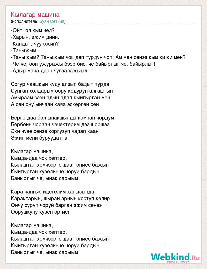 -Ойт, ол кым чел? -Харын, эжим диин. -Кандыг, чуу эжин? -Таныжым. -Таныжым? Таныжым чок деп турдун чоп! Ам мен сенээ кым кижи мен? -Че-че, оон ужуражы бээр бис, че байырлыг че, байырлыг! -Адыр мана даан чугаалажыыл! Согур чаашкын куду алзып бадып турда Сунган холдарым оору кодуруп алгаштын Амыраам сээн адын адап кыйгырган мен А сен ону ынчаан каяа эскерген сен Берге-даа бол ынакшылды камнап чордум Бербейн чораан чечектерим дээш оршээ Эки чуве сенээ коргузуп чадап каан Эжин мени буруудатпа Кылагар машина, Кымда-даа чок хептер, Кылаштап хемчээрге-даа тонмес бажын Кыйгырган кузелинче чоруй бардын Байырлыг че, ынак сарыым Кара чангыс идегелим ханызында Карактарын, шырай арнын коступ келир Ончу суруп чоруй барган эжим сенээ Оорушкуну кузеп ор мен Кылагар машина, Кымда-даа чок хептер, Кылаштап хемчээрге-даа тонмес бажын Кыйгырган кузелинче чоруй бардын Байырлыг че, ынак сарыым
