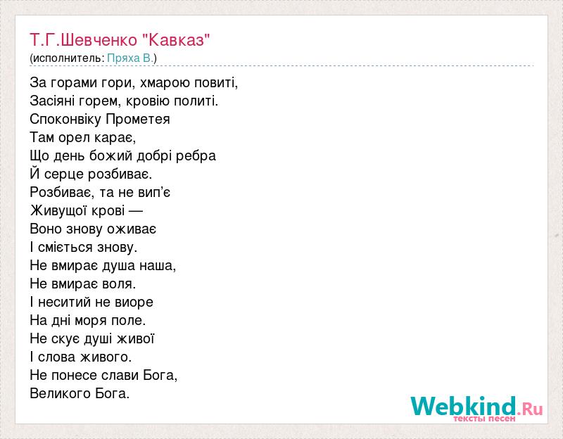 За горами гори, хмарою повиті, Засіяні горем, кровію политі. Споконвіку Прометея Там орел карає, Що день божий добрі ребра Й серце розбиває. Розбиває, та не вип’є Живущої крові — Воно знову оживає І сміється знову. Не вмирає душа наша, Не вмирає воля. І неситий не виоре На дні моря поле. Не скує душі живої І слова живого. Не понесе слави Бога, Великого Бога.