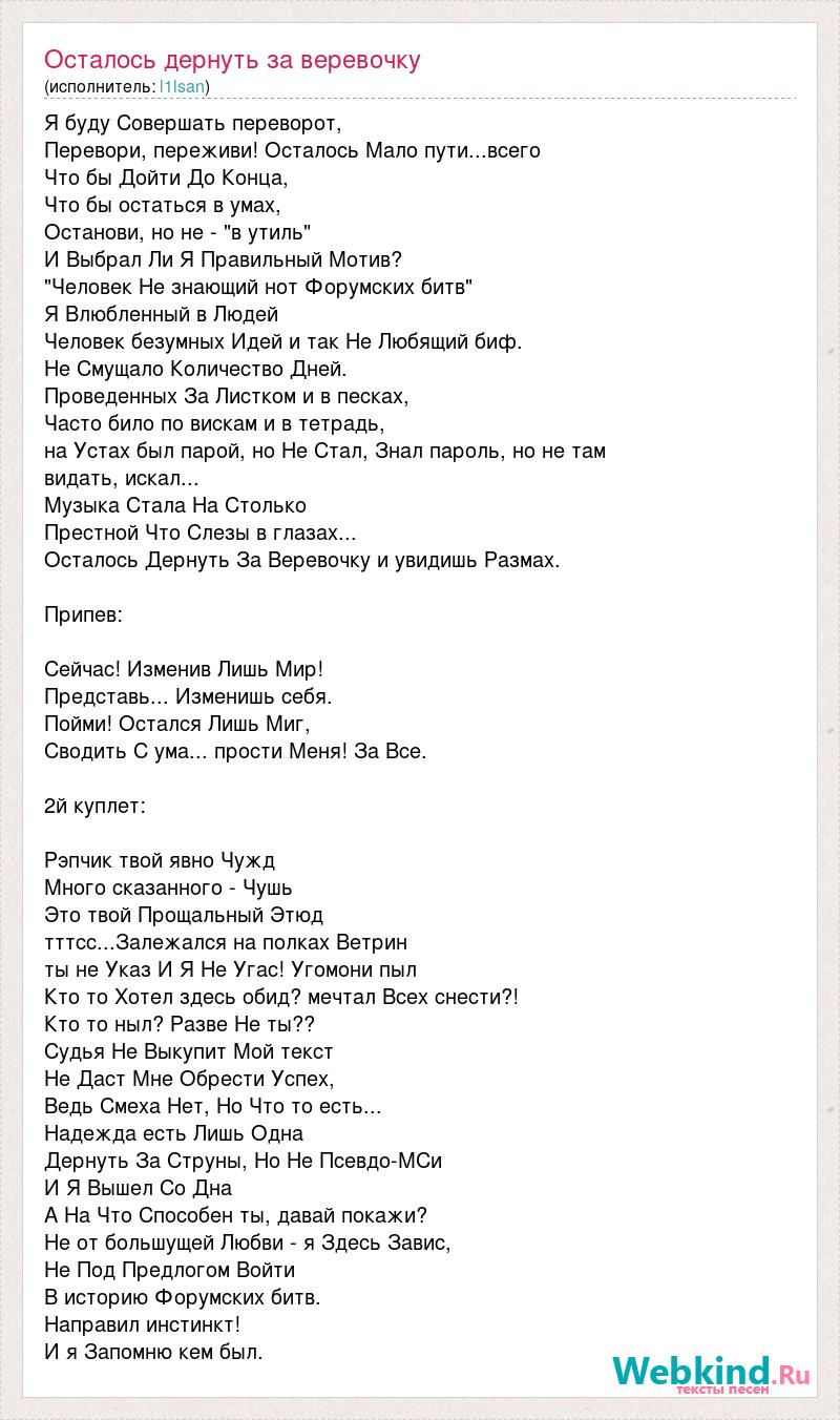 Я буду Совершать переворот, Перевори, переживи! Осталось Мало пути...всего Что бы Дойти До Конца, Что бы остаться в умах, Останови, но не - "в утиль" И Выбрал Ли Я Правильный Мотив? "Человек Не знающий нот Форумских битв" Я Влюбленный в Людей Человек безумных Идей и так Не Любящий биф. Не Смущало Количество Дней. Проведенных За Листком и в песках, Часто било по вискам и в тетрадь, на Устах был парой, но Не Стал, Знал пароль, но не там видать, искал... Музыка Стала На Столько Престной Что Слезы в глазах... Осталось Дернуть За Веревочку и увидишь Размах. Припев: Сейчас! Изменив Лишь Мир! Представь... Изменишь себя. Пойми! Остался Лишь Миг, Сводить С ума... прости Меня! За Все. 2й куплет: Рэпчик твой явно Чужд Много cказанного - Чушь Это твой Прощальный Этюд тттсс...Залежался на полках Ветрин ты не Указ И Я Не Угас! Угомони пыл Кто то Хотел здесь обид? мечтал Всех снести?! Кто то ныл? Разве Не ты?? Судья Не Выкупит Мой текст Не Даст Мне Обрести Успех, Ведь Смеха Нет, Но Что то есть... Надежда есть Лишь Одна Дернуть За Струны, Но Не Псевдо-МСи И Я Вышел Со Дна А На Что Способен ты, давай покажи? Не от большущей Любви - я Здесь Завис, Не Под Предлогом Войти В историю Форумских битв. Направил инстинкт! И я Запомню кем был.