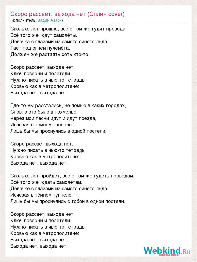 Сколько лет прошло, всё о том же гудят провода, Всё того же ждут самолёты. Девочка с глазами из самого синего льда Тает под огнём пулемёта. Должен же растаять хоть кто-то. Скоро рассвет, выхода нет, Ключ поверни и полетели. Нужно писать в чью-то тетрадь Кровью как в метрополитене: Выхода нет, выхода нет. Где-то мы расстались, не помню в каких городах, Словно это было в похмелье. Через мои песни идут и идут поезда, Исчезая в тёмном тоннеле. Лишь бы мы проснулись в одной постели. Скоро рассвет выхода нет, Нужно писать в чью-то тетрадь Кровью как в метрополитене: Выхода нет, выхода нет. Сколько лет пройдёт, всё о том же гудеть проводам, Всё того же ждать самолётам. Девочке с глазами из самого синего льда Исчезая в тёмном туннеле, Лишь бы мы проснулись с тобой в одной постели. Скоро рассвет, выхода нет, Ключ поверни и полетели. Нужно писать в чью-то тетрадь Кровью как в метрополитене: Выхода нет, выхода нет, Выхода нет, выхода нет.