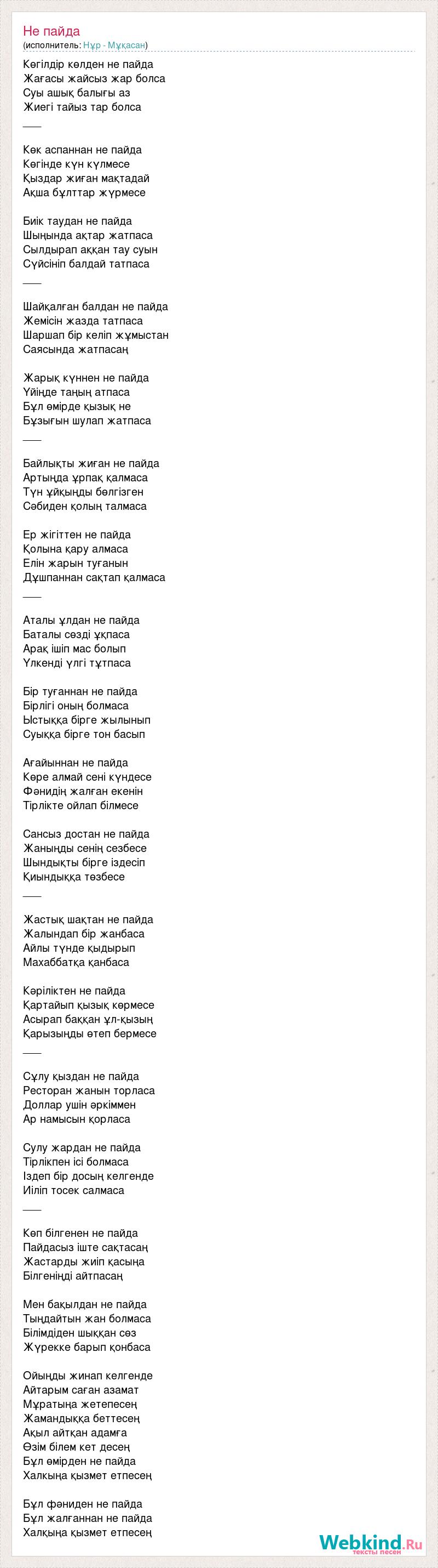 Көгiлдiр көлден не пайда Жағасы жайсыз жар болса Суы ашық балығы аз Жиегі тайыз тар болса ___ Көк аспаннан не пайда Көгiнде күн күлмесе Қыздар жиған мақтадай Ақша бұлттар жүрмесе Биік таудан не пайда Шыңында ақтар жатпаса Сылдырап аққан тау суын Сүйсініп балдай татпаса ___ Шайқалған балдан не пайда Жемiсiн жазда татпаса Шаршап бiр келiп жұмыстан Саясында жатпасаң Жарық күннен не пайда Үйіңде таңың атпаса Бұл өмiрде қызық не Бұзығын шулап жатпаса ___ Байлықты жиған не пайда Артыңда ұрпақ қалмаса Түн ұйқыңды бөлгізген Сәбиден қолың талмаса Ер жiгiттен не пайда Қолына қару алмаса Елiн жарын туғанын Дұшпаннан сақтап қалмаса ___ Аталы ұлдан не пайда Баталы сөздi ұқпаса Арақ iшiп мас болып Үлкенді үлгi тұтпаса Бір туғаннан не пайда Бірлігі оның болмаса Ыстыққа бірге жылынып Суыққа бірге тон басып Ағайыннан не пайда Көре алмай сенi күндесе Фәнидің жалған екенiн Тiрлiкте ойлап бiлмесе Сансыз достан не пайда Жаныңды сенiң сезбесе Шындықты бiрге іздесіп Қиындыққа төзбесе ___ Жастық шақтан не пайда Жалындап бір жанбаса Айлы түнде қыдырып Махаббатқа қанбаса Кәрiлiктен не пайда Қартайып қызық көрмесе Асырап баққан ұл-қызың Қарызыңды өтеп бермесе ___ Сұлу қыздан не пайда Ресторан жанын торласа Доллар ушiн әркіммен Ар намысын қорласа Сулу жардан не пайда Тiрлiкпен iсi болмаса Iздеп бiр досың келгенде Иiлiп тосек салмаса ___ Көп бiлгенен не пайда Пайдасыз iште сақтасаң Жастарды жиіп қасыңа Бiлгенiңді айтпасаң Мен бақылдан не пайда Тыңдайтын жан болмаса Бiлiмдiден шыққан сөз Жүрекке барып қонбаса Ойыңды жинап келгенде Айтарым саған азамат Мұратыңа жетепесең Жамандыққа беттесең Ақыл айтқан адамға Өзім білем кет десең Бұл өмірден не пайда Халкыңа қызмет етпесең Бұл фәниден не пайда Бұл жалғаннан не пайда Халқыңа қызмет етпесең