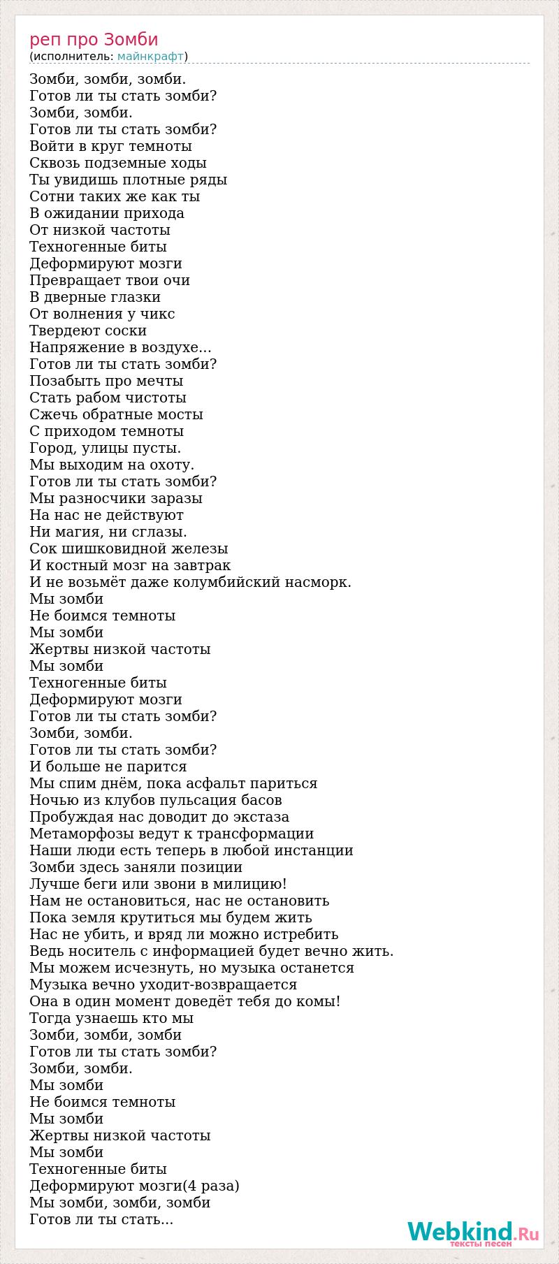 Зомби, зомби, зомби. Готов ли ты стать зомби? Зомби, зомби. Готов ли ты стать зомби? Войти в круг темноты Сквозь подземные ходы Ты увидишь плотные ряды Сотни таких же как ты В ожидании прихода От низкой частоты Техногенные биты Деформируют мозги Превращает твои очи В дверные глазки От волнения у чикс Твердеют соски Напряжение в воздухе... Готов ли ты стать зомби? Позабыть про мечты Стать рабом чистоты Сжечь обратные мосты С приходом темноты Город, улицы пусты. Мы выходим на охоту. Готов ли ты стать зомби? Мы разносчики заразы На нас не действуют Ни магия, ни сглазы. Сок шишковидной железы И костный мозг на завтрак И не возьмёт даже колумбийский насморк. Мы зомби Не боимся темноты Мы зомби Жертвы низкой частоты Мы зомби Техногенные биты Деформируют мозги Готов ли ты стать зомби? Зомби, зомби. Готов ли ты стать зомби? И больше не парится Мы спим днём, пока асфальт париться Ночью из клубов пульсация басов Пробуждая нас доводит до экстаза Метаморфозы ведут к трансформации Наши люди есть теперь в любой инстанции Зомби здесь заняли позиции Лучше беги или звони в милицию! Нам не остановиться, нас не остановить Пока земля крутиться мы будем жить Нас не убить, и вряд ли можно истребить Ведь носитель с информацией будет вечно жить. Мы можем исчезнуть, но музыка останется Музыка вечно уходит-возвращается Она в один момент доведёт тебя до комы! Тогда узнаешь кто мы Зомби, зомби, зомби Готов ли ты стать зомби? Зомби, зомби. Мы зомби Не боимся темноты Мы зомби Жертвы низкой частоты Мы зомби Техногенные биты Деформируют мозги(4 раза) Мы зомби, зомби, зомби Готов ли ты стать...