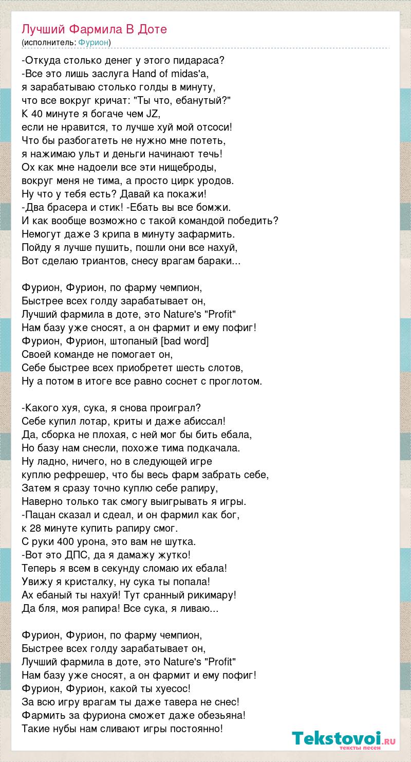 -Откуда столько денег у этого пидараса? -Все это лишь заслуга Hand of midas'a, я зарабатываю столько голды в минуту, что все вокруг кричат: "Ты что, ебанутый?" К 40 минуте я богаче чем JZ, если не нравится, то лучше хуй мой отсоси! Что бы разбогатеть не нужно мне потеть, я нажимаю ульт и деньги начинают течь! Ох как мне надоели все эти нищеброды, вокруг меня не тима, а просто цирк уродов. Ну что у тебя есть? Давай ка покажи! -Два брасера и стик! -Ебать вы все бомжи. И как вообще возможно с такой командой победить? Немогут даже 3 крипа в минуту зафармить. Пойду я лучше пушить, пошли они все нахуй, Вот сделаю триантов, снесу врагам бараки... Фурион, Фурион, по фарму чемпион, Быстрее всех голду зарабатывает он, Лучший фармила в доте, это Nature's "Profit" Нам базу уже сносят, а он фармит и ему пофиг! Фурион, Фурион, штопаный [bad word] Своей команде не помогает он, Себе быстрее всех приобретет шесть слотов, Ну а потом в итоге все равно соснет с проглотом. -Какого хуя, сука, я снова проиграл? Себе купил лотар, криты и даже абиссал! Да, сборка не плохая, с ней мог бы бить ебала, Но базу нам снесли, похоже тима подкачала. Ну ладно, ничего, но в следующей игре куплю рефрешер, что бы весь фарм забрать себе, Затем я сразу точно куплю себе рапиру, Наверно только так смогу выигрывать я игры. -Пацан сказал и сдеал, и он фармил как бог, к 28 минуте купить рапиру смог. С руки 400 урона, это вам не шутка. -Вот это ДПС, да я дамажу жутко! Теперь я всем в секунду сломаю их ебала! Увижу я кристалку, ну сука ты попала! Ах ебаный ты нахуй! Тут сранный рикимару! Да бля, моя рапира! Все сука, я ливаю... Фурион, Фурион, по фарму чемпион, Быстрее всех голду зарабатывает он, Лучший фармила в доте, это Nature's "Profit" Нам базу уже сносят, а он фармит и ему пофиг! Фурион, Фурион, какой ты хуесос! За всю игру врагам ты даже тавера не снес! Фармить за фуриона сможет даже обезьяна! Такие нубы нам сливают игры постоянно!