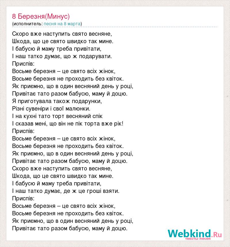 Скоро вже наступить свято весняне, Шкода, що це свято швидко так мине. І бабусю й маму треба привітати, І наш татко думає, що ж подарувати. Приспів: Восьме березня – це свято всіх жінок, Восьме березня не проходить без квіток. Як приємно, що в один весняний день у році, Привітає тато разом бабусю, маму й доцю. Я приготувала також подарунки, Різні сувеніри і свої малюнки. І на кухні тато торт весняний спік І сказав мені, що він не пік торта вже рік! Приспів: Восьме березня – це свято всіх жінок, Восьме березня не проходить без квіток. Як приємно, що в один весняний день у році, Привітає тато разом бабусю, маму й доцю. Скоро вже наступить свято весняне, Шкода, що це свято швидко так мине. І бабусю й маму треба привітати, І наш татко думає, де ж це гроші взяти. Приспів: Восьме березня – це свято всіх жінок, Восьме березня не проходить без квіток. Як приємно, що в один весняний день у році, Привітає тато разом бабусю, маму й доцю.
