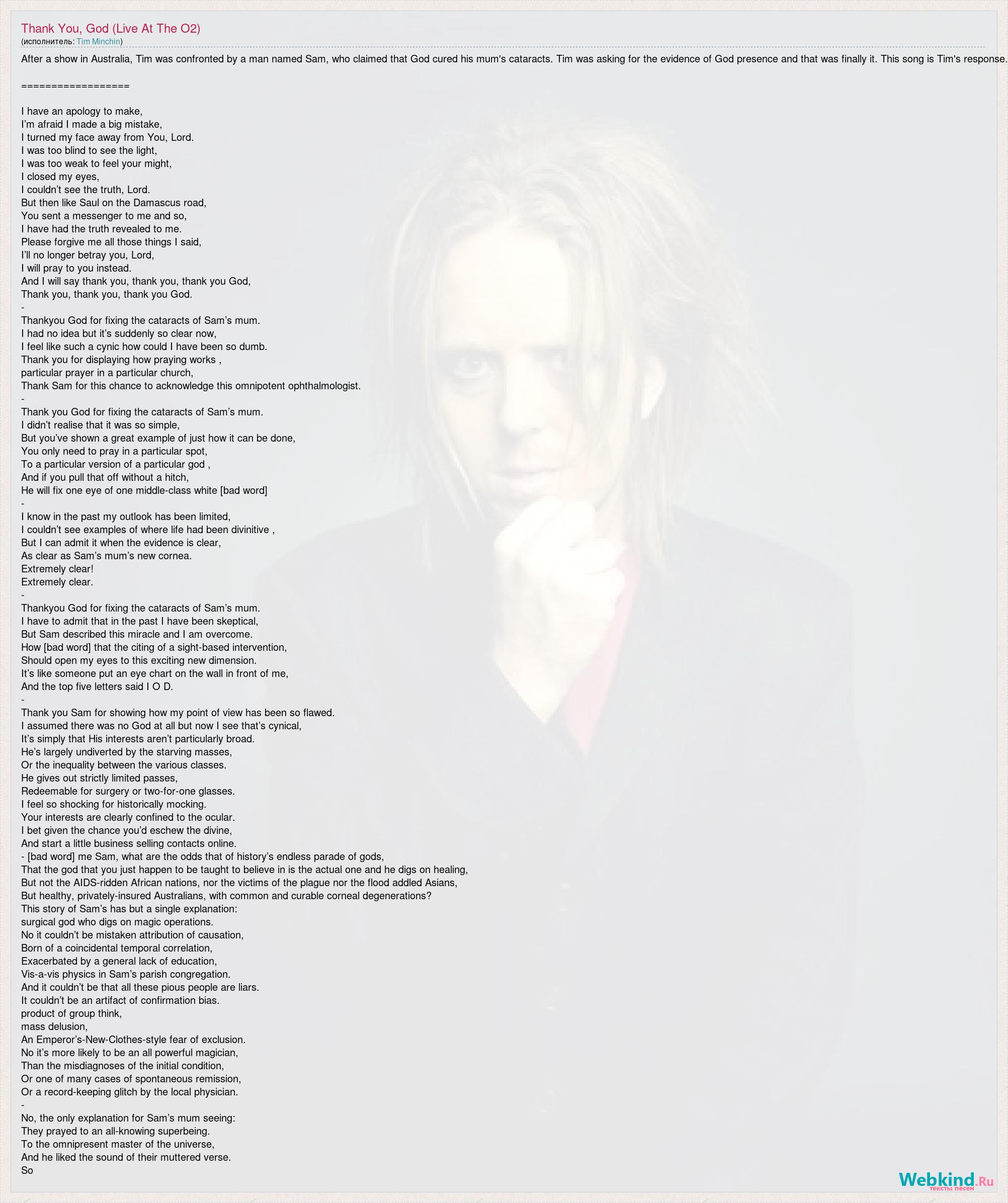 After a show in Australia, Tim was confronted by a man named Sam, who claimed that God cured his mum's cataracts. Tim was asking for the evidence of God presence and that was finally it. This song is Tim's response. ================== I have an apology to make, I’m afraid I made a big mistake, I turned my face away from You, Lord. I was too blind to see the light, I was too weak to feel your might, I closed my eyes, I couldn’t see the truth, Lord. But then like Saul on the Damascus road, You sent a messenger to me and so, I have had the truth revealed to me. Please forgive me all those things I said, I’ll no longer betray you, Lord, I will pray to you instead. And I will say thank you, thank you, thank you God, Thank you, thank you, thank you God. - Thankyou God for fixing the cataracts of Sam’s mum. I had no idea but it’s suddenly so clear now, I feel like such a cynic how could I have been so dumb. Thank you for displaying how praying works , particular prayer in a particular church, Thank Sam for this chance to acknowledge this omnipotent ophthalmologist. - Thank you God for fixing the cataracts of Sam’s mum. I didn’t realise that it was so simple, But you’ve shown a great example of just how it can be done, You only need to pray in a particular spot, To a particular version of a particular god , And if you pull that off without a hitch, He will fix one eye of one middle-class white [bad word] - I know in the past my outlook has been limited, I couldn’t see examples of where life had been divinitive , But I can admit it when the evidence is clear, As clear as Sam’s mum’s new cornea. Extremely clear! Extremely clear. - Thankyou God for fixing the cataracts of Sam’s mum. I have to admit that in the past I have been skeptical, But Sam described this miracle and I am overcome. How [bad word] that the citing of a sight-based intervention, Should open my eyes to this exciting new dimension. It’s like someone put an eye chart on the wall in front of me, And the top five letters said I O D. - Thank you Sam for showing how my point of view has been so flawed. I assumed there was no God at all but now I see that’s cynical, It’s simply that His interests aren’t particularly broad. He’s largely undiverted by the starving masses, Or the inequality between the various classes. He gives out strictly limited passes, Redeemable for surgery or two-for-one glasses. I feel so shocking for historically mocking. Your interests are clearly confined to the ocular. I bet given the chance you’d eschew the divine, And start a little business selling contacts online. - [bad word] me Sam, what are the odds that of history’s endless parade of gods, That the god that you just happen to be taught to believe in is the actual one and he digs on healing, But not the AIDS-ridden African nations, nor the victims of the plague nor the flood addled Asians, But healthy, privately-insured Australians, with common and curable corneal degenerations? This story of Sam’s has but a single explanation: surgical god who digs on magic operations. No it couldn’t be mistaken attribution of causation, Born of a coincidental temporal correlation, Exacerbated by a general lack of education, Vis-a-vis physics in Sam’s parish congregation. And it couldn’t be that all these pious people are liars. It couldn’t be an artifact of confirmation bias. product of group think, mass delusion, An Emperor’s-New-Clothes-style fear of exclusion. No it’s more likely to be an all powerful magician, Than the misdiagnoses of the initial condition, Or one of many cases of spontaneous remission, Or a record-keeping glitch by the local physician. - No, the only explanation for Sam’s mum seeing: They prayed to an all-knowing superbeing. To the omnipresent master of the universe, And he liked the sound of their muttered verse. So