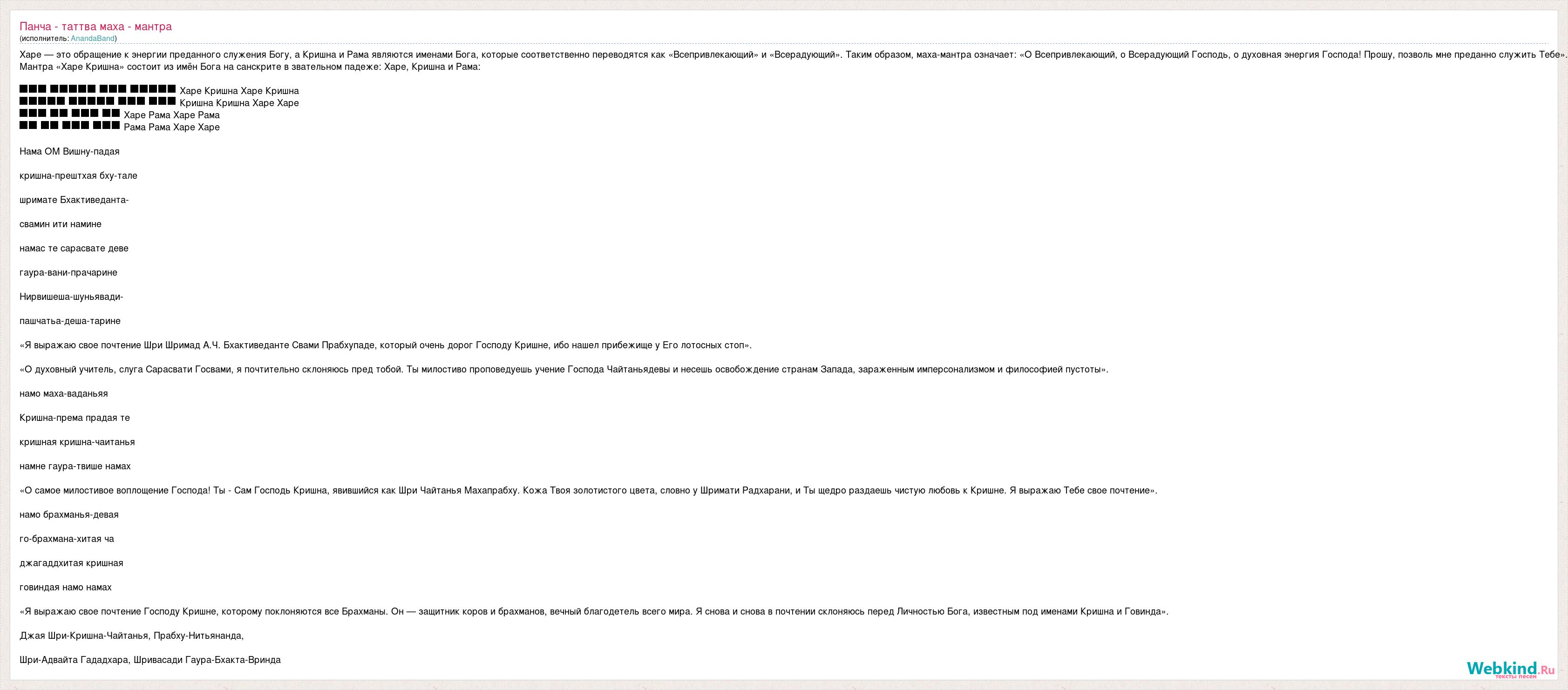 Харе — это обращение к энергии преданного служения Богу, а Кришна и Рама являются именами Бога, которые соответственно переводятся как «Всепривлекающий» и «Всерадующий». Таким образом, маха-мантра означает: «О Всепривлекающий, о Всерадующий Господь, о духовная энергия Господа! Прошу, позволь мне преданно служить Тебе». Мантра «Харе Кришна» состоит из имён Бога на санскрите в звательном падеже: Харе, Кришна и Рама: हरे कृष्ण हरे कृष्ण Харе Кришна Харе Кришна कृष्ण कृष्ण हरे हरे Кришна Кришна Харе Харе हरे रम हरे रम Харе Рама Харе Рама रम रम हरे हरे Рама Рама Харе Харе Нама ОМ Вишну-падая кришна-прештхая бху-тале шримате Бхактиведанта- свамин ити намине намас те сарасвате деве гаура-вани-прачарине Нирвишеша-шуньявади- пашчатьа-деша-тарине «Я выражаю свое почтение Шри Шримад А.Ч. Бхактиведанте Свами Прабхупаде, который очень дорог Господу Кришне, ибо нашел прибежище у Его лотосных стоп». «О духовный учитель, слуга Сарасвати Госвами, я почтительно склоняюсь пред тобой. Ты милостиво проповедуешь учение Господа Чайтаньядевы и несешь освобождение странам Запада, зараженным имперсонализмом и философией пустоты». намо маха-ваданьяя Кришна-према прадая те кришная кришна-чаитанья намне гаура-твише намах «О самое милостивое воплощение Господа! Ты - Сам Господь Кришна, явившийся как Шри Чайтанья Махапрабху. Кожа Твоя золотистого цвета, словно у Шримати Радхарани, и Ты щедро раздаешь чистую любовь к Кришне. Я выражаю Тебе свое почтение». намо брахманья-девая го-брахмана-хитая ча джагаддхитая кришная говиндая намо намах «Я выражаю свое почтение Господу Кришне, которому поклоняются все Брахманы. Он — защитник коров и брахманов, вечный благодетель всего мира. Я снова и снова в почтении склоняюсь перед Личностью Бога, известным под именами Кришна и Говинда». Джая Шри-Кришна-Чайтанья, Прабху-Нитьянанда, Шри-Адвайта Гададхара, Шривасади Гаура-Бхакта-Вринда
