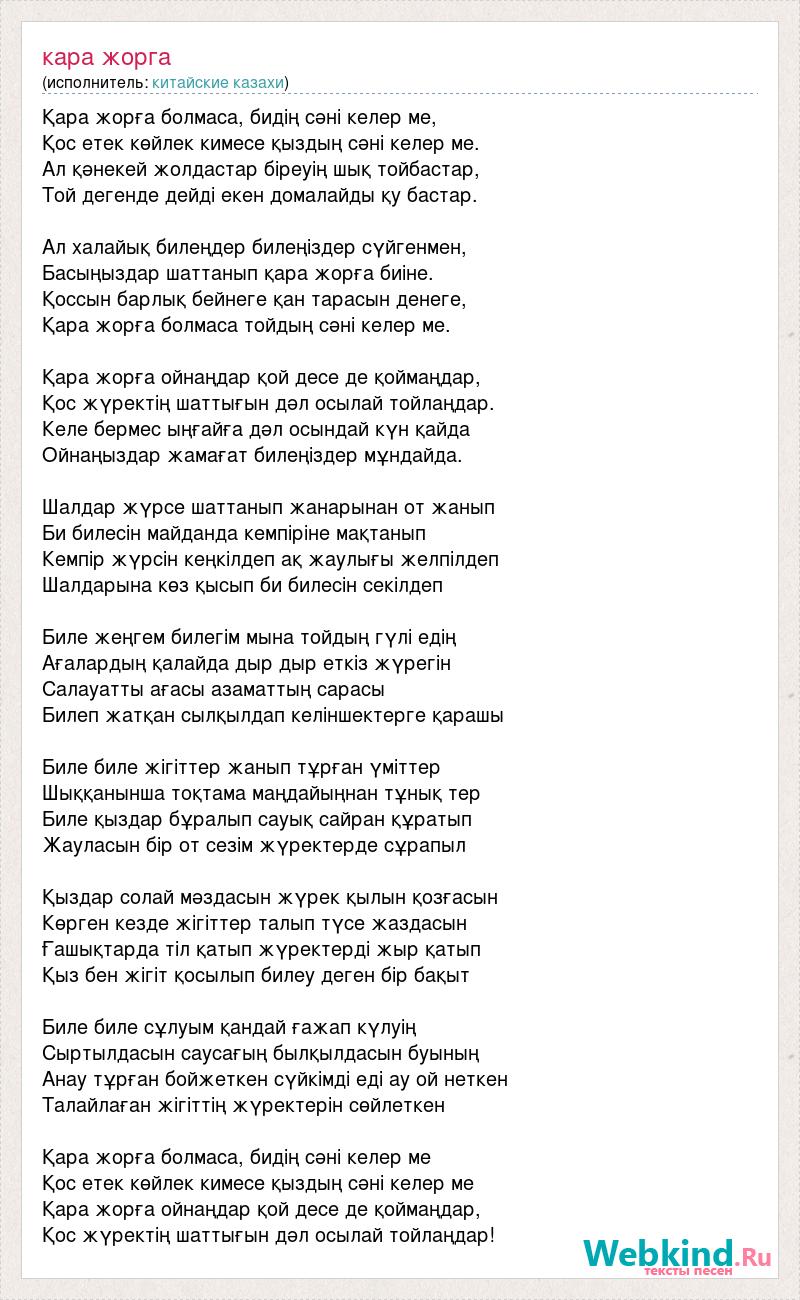 Қара жорға болмаса, бидің сәні келер ме, Қос етек көйлек кимесе қыздың сәні келер ме. Ал қәнекей жолдастар біреуің шық тойбастар, Той дегенде дейді екен домалайды қу бастар. Ал халайық билеңдер билеңіздер сүйгенмен, Басыңыздар шаттанып қара жорға биіне. Қоссын барлық бейнеге қан тарасын денеге, Қара жорға болмаса тойдың сәні келер ме. Қара жорға ойнаңдар қой десе де қоймаңдар, Қос жүректің шаттығын дәл осылай тойлаңдар. Келе бермес ыңғайға дәл осындай күн қайда Ойнаңыздар жамағат билеңіздер мұндайда. Шалдар жүрсе шаттанып жанарынан от жанып Би билесін майданда кемпіріне мақтанып Кемпір жүрсін кеңкілдеп ақ жаулығы желпілдеп Шалдарына көз қысып би билесін секілдеп Биле жеңгем билегім мына тойдың гүлі едің Ағалардың қалайда дыр дыр еткіз жүрегін Салауатты ағасы азаматтың сарасы Билеп жатқан сылқылдап келіншектерге қарашы Биле биле жігіттер жанып тұрған үміттер Шыққанынша тоқтама маңдайыңнан тұнық тер Биле қыздар бұралып сауық сайран құратып Жауласын бір от сезім жүректерде сұрапыл Қыздар солай мәздасын жүрек қылын қозғасын Көрген кезде жігіттер талып түсе жаздасын Ғашықтарда тіл қатып жүректерді жыр қатып Қыз бен жігіт қосылып билеу деген бір бақыт Биле биле сұлуым қандай ғажап күлуің Сыртылдасын саусағың былқылдасын буының Анау тұрған бойжеткен сүйкімді еді ау ой неткен Талайлаған жігіттің жүректерін сөйлеткен Қара жорға болмаса, бидің сәні келер ме Қос етек көйлек кимесе қыздың сәні келер ме Қара жорға ойнаңдар қой десе де қоймаңдар, Қос жүректің шаттығын дәл осылай тойлаңдар!