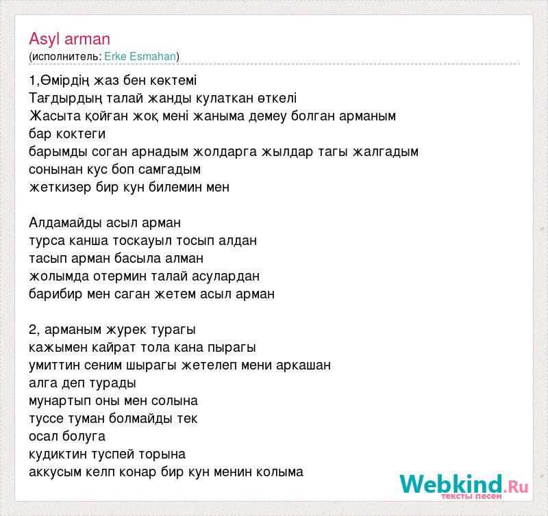 1,Өмірдің жаз бен көктемі Тағдырдың талай жанды кулаткан өткелі Жасыта қойған жоқ мені жаныма демеу болган арманым бар коктеги барымды соган арнадым жолдарга жылдар тагы жалгадым сонынан кус боп самгадым жеткизер бир кун билемин мен Алдамайды асыл арман турса канша тоскауыл тосып алдан тасып арман басыла алман жолымда отермин талай асулардан барибир мен саган жетем асыл арман 2, арманым журек турагы кажымен кайрат тола кана пырагы умиттин сеним шырагы жетелеп мени аркашан алга деп турады мунартып оны мен солына туссе туман болмайды тек осал болуга кудиктин туспей торына аккусым келп конар бир кун менин колыма