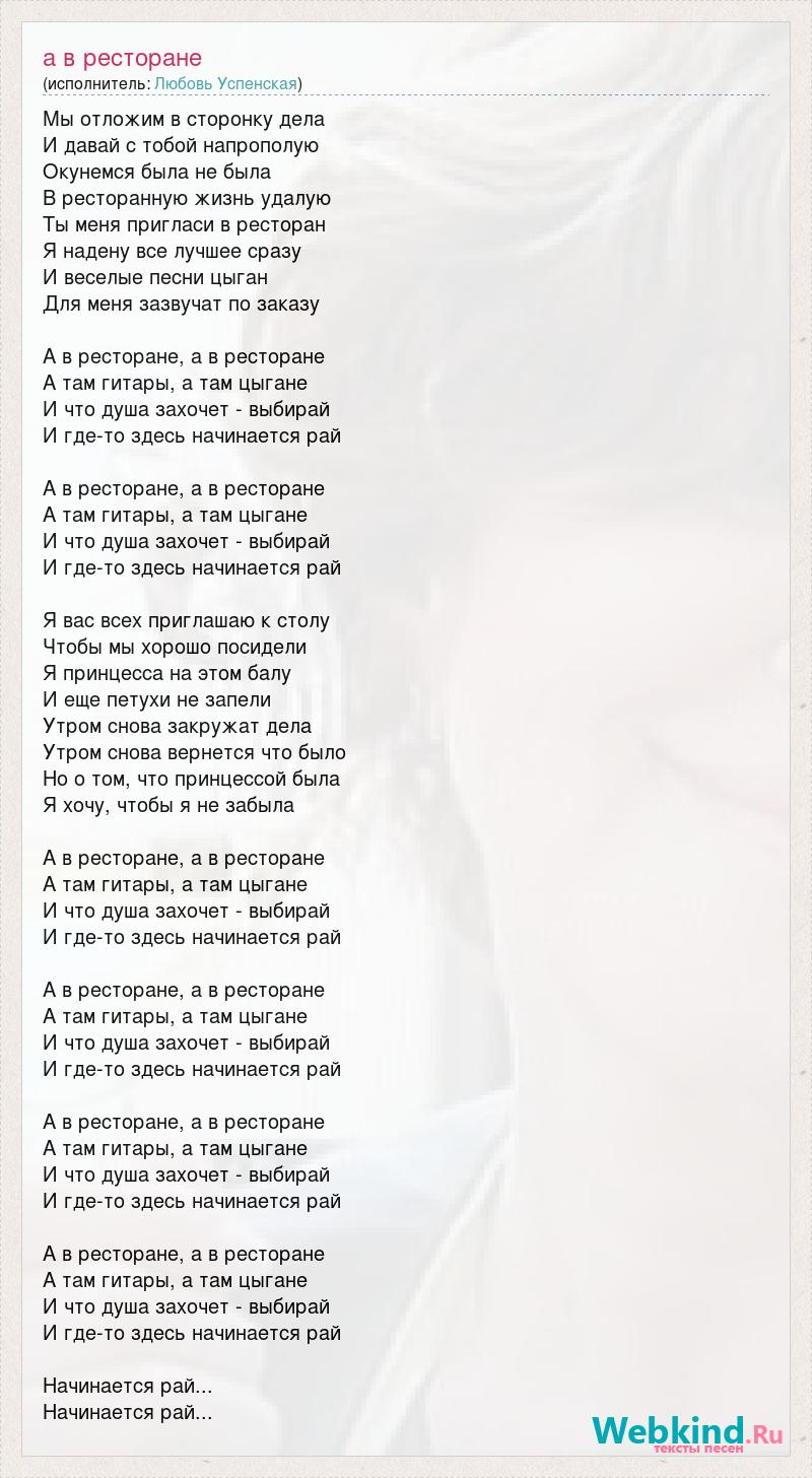 Мы отложим в сторонку дела И давай с тобой напрополую Окунемся была не была В ресторанную жизнь удалую Ты меня пригласи в ресторан Я надену все лучшее сразу И веселые песни цыган Для меня зазвучат по заказу А в ресторане, а в ресторане А там гитары, а там цыгане И что душа захочет - выбирай И где-то здесь начинается рай А в ресторане, а в ресторане А там гитары, а там цыгане И что душа захочет - выбирай И где-то здесь начинается рай Я вас всех приглашаю к столу Чтобы мы хорошо посидели Я принцесса на этом балу И еще петухи не запели Утром снова закружат дела Утром снова вернется что было Но о том, что принцессой была Я хочу, чтобы я не забыла А в ресторане, а в ресторане А там гитары, а там цыгане И что душа захочет - выбирай И где-то здесь начинается рай А в ресторане, а в ресторане А там гитары, а там цыгане И что душа захочет - выбирай И где-то здесь начинается рай А в ресторане, а в ресторане А там гитары, а там цыгане И что душа захочет - выбирай И где-то здесь начинается рай А в ресторане, а в ресторане А там гитары, а там цыгане И что душа захочет - выбирай И где-то здесь начинается рай Начинается рай... Начинается рай...