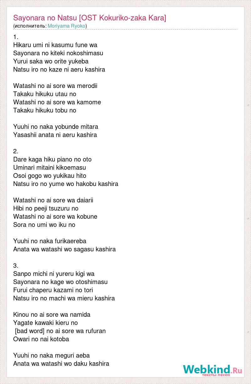 1. Hikaru umi ni kasumu fune wa Sayonara no kiteki nokoshimasu Yurui saka wo orite yukeba Natsu iro no kaze ni aeru kashira Watashi no ai sore wa merodii Takaku hikuku utau no Watashi no ai sore wa kamome Takaku hikuku tobu no Yuuhi no naka yobunde mitara Yasashii anata ni aeru kashira 2. Dare kaga hiku piano no oto Uminari mitaini kikoemasu Osoi gogo wo yukikau hito Natsu iro no yume wo hakobu kashira Watashi no ai sore wa daiarii Hibi no peeji tsuzuru no Watashi no ai sore wa kobune Sora no umi wo iku no Yuuhi no naka furikaereba Anata wa watashi wo sagasu kashira 3. Sanpo michi ni yureru kigi wa Sayonara no kage wo otoshimasu Furui chaperu kazami no tori Natsu iro no machi wa mieru kashira Kinou no ai sore wa namida Yagate kawaki kieru no [bad word] no ai sore wa rufuran Owari no nai kotoba Yuuhi no naka meguri aeba Anata wa watashi wo daku kashira