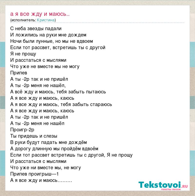 С неба звезды падали И ложились на руки мне дождем Ночи были лунные, но мы не вдвоем Если тот рассвет, встретишь ты с другой Я не прощу И расстаться с мыслями Что уже не вместе мы не могу Припев А ты -2р так и не пришёл А ты -2р меня не нашёл, А всё жду и маюсь, тебя забыть пытаюсь А я все жду и маюсь, каюсь А я все жду и маюсь, тебя забыть стараюсь А я все жду и маюсь, каюсь А ты -2р так и не пришёл А ты -2р меня не нашёл Проигр-2р Ты придешь и слезы В руки будут падать мне дождём А дорогу длинную мы пройдём вдвоём Если тот рассвет встретишь ты с другой, Я не прощу И расстаться с мыслями Что уже ни вместе мы, не могу Припев проигрыш—1 А я все жду и маюсь………