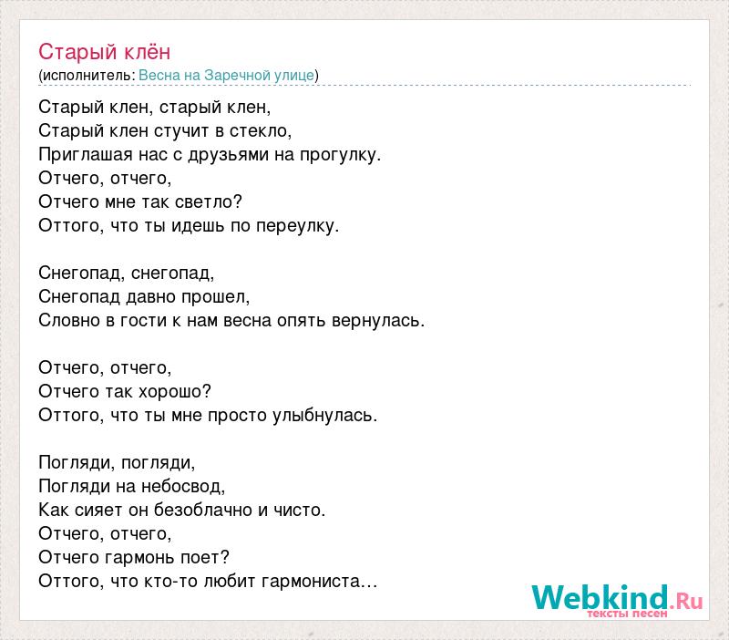 Старый клен, старый клен, Старый клен стучит в стекло, Приглашая нас с друзьями на прогулку. Отчего, отчего, Отчего мне так светло? Оттого, что ты идешь по переулку. Снегопад, снегопад, Снегопад давно прошел, Словно в гости к нам весна опять вернулась. Отчего, отчего, Отчего так хорошо? Оттого, что ты мне просто улыбнулась. Погляди, погляди, Погляди на небосвод, Как сияет он безоблачно и чисто. Отчего, отчего, Отчего гармонь поет? Оттого, что кто-то любит гармониста…