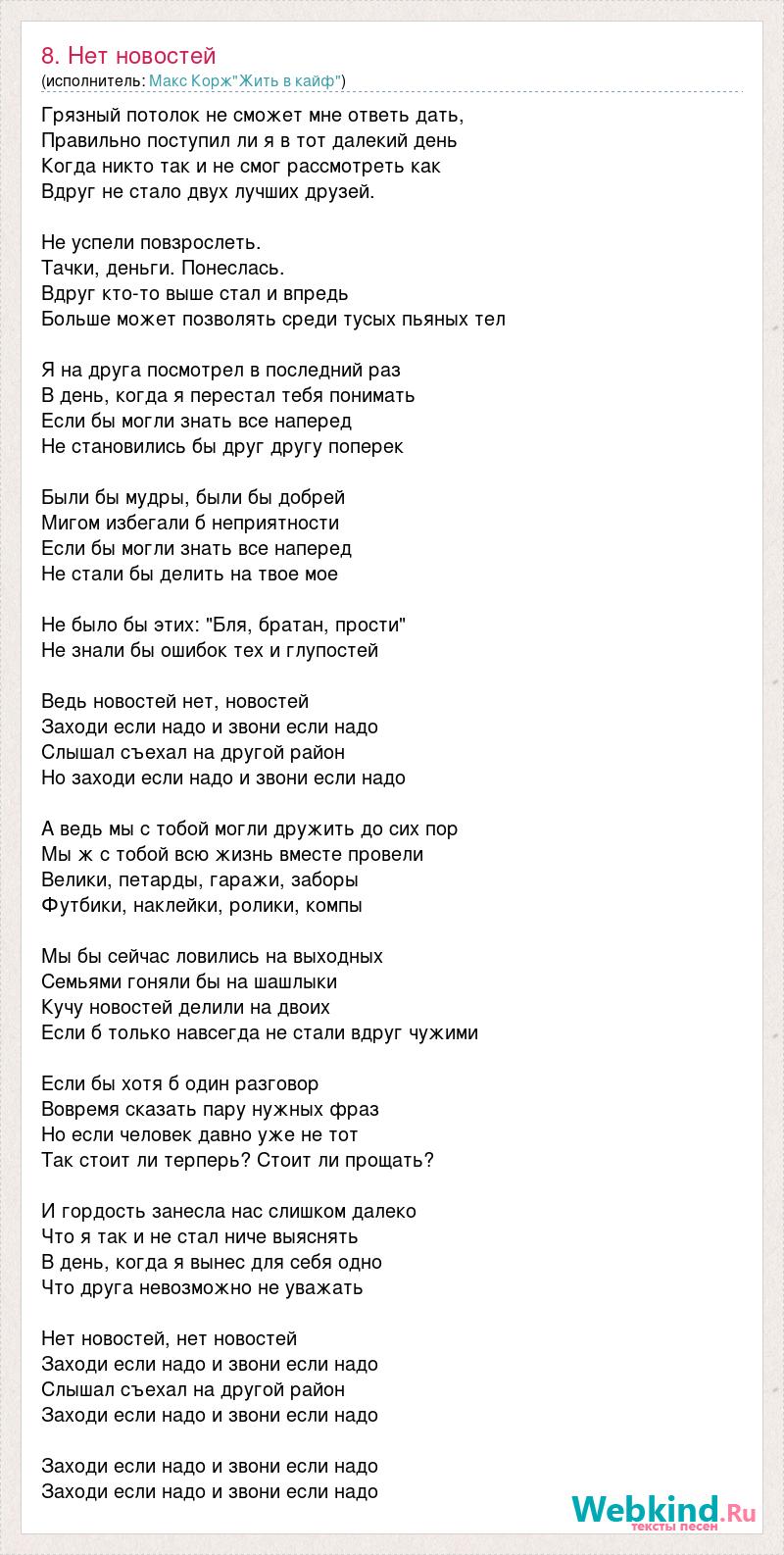 Грязный потолок не сможет мне ответь дать, Правильно поступил ли я в тот далекий день Когда никто так и не смог рассмотреть как Вдруг не стало двух лучших друзей. Не успели повзрослеть. Тачки, деньги. Понеслась. Вдруг кто-то выше стал и впредь Больше может позволять среди тусых пьяных тел Я на друга посмотрел в последний раз В день, когда я перестал тебя понимать Если бы могли знать все наперед Не становились бы друг другу поперек Были бы мудры, были бы добрей Мигом избегали б неприятности Если бы могли знать все наперед Не стали бы делить на твое мое Не было бы этих: "Бля, братан, прости" Не знали бы ошибок тех и глупостей Ведь новостей нет, новостей Заходи если надо и звони если надо Слышал съехал на другой район Но заходи если надо и звони если надо А ведь мы с тобой могли дружить до сих пор Мы ж с тобой всю жизнь вместе провели Велики, петарды, гаражи, заборы Футбики, наклейки, ролики, компы Мы бы сейчас ловились на выходных Семьями гоняли бы на шашлыки Кучу новостей делили на двоих Если б только навсегда не стали вдруг чужими Если бы хотя б один разговор Вовремя сказать пару нужных фраз Но если человек давно уже не тот Так стоит ли терперь? Стоит ли прощать? И гордость занесла нас слишком далеко Что я так и не стал ниче выяснять В день, когда я вынес для себя одно Что друга невозможно не уважать Нет новостей, нет новостей Заходи если надо и звони если надо Слышал съехал на другой район Заходи если надо и звони если надо Заходи если надо и звони если надо Заходи если надо и звони если надо