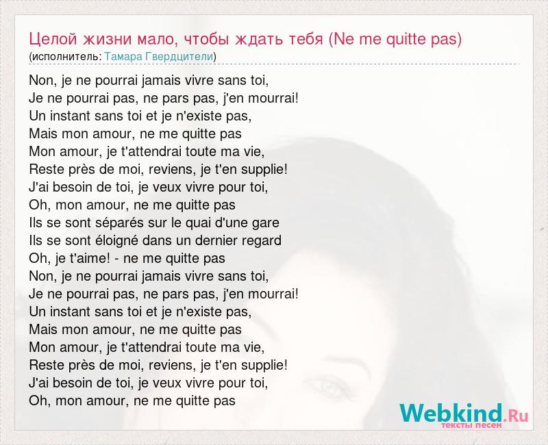 Non, je ne pourrai jamais vivre sans toi, Je ne pourrai pas, ne pars pas, j'en mourrai! Un instant sans toi et je n'existe pas, Mais mon amour, ne me quitte pas Mon amour, je t'attendrai toute ma vie, Reste près de moi, reviens, je t'en supplie! J'ai besoin de toi, je veux vivre pour toi, Oh, mon amour, ne me quitte pas Ils se sont séparés sur le quai d'une gare Ils se sont éloigné dans un dernier regard Oh, je t'aime! - ne me quitte pas Non, je ne pourrai jamais vivre sans toi, Je ne pourrai pas, ne pars pas, j'en mourrai! Un instant sans toi et je n'existe pas, Mais mon amour, ne me quitte pas Mon amour, je t'attendrai toute ma vie, Reste près de moi, reviens, je t'en supplie! J'ai besoin de toi, je veux vivre pour toi, Oh, mon amour, ne me quitte pas