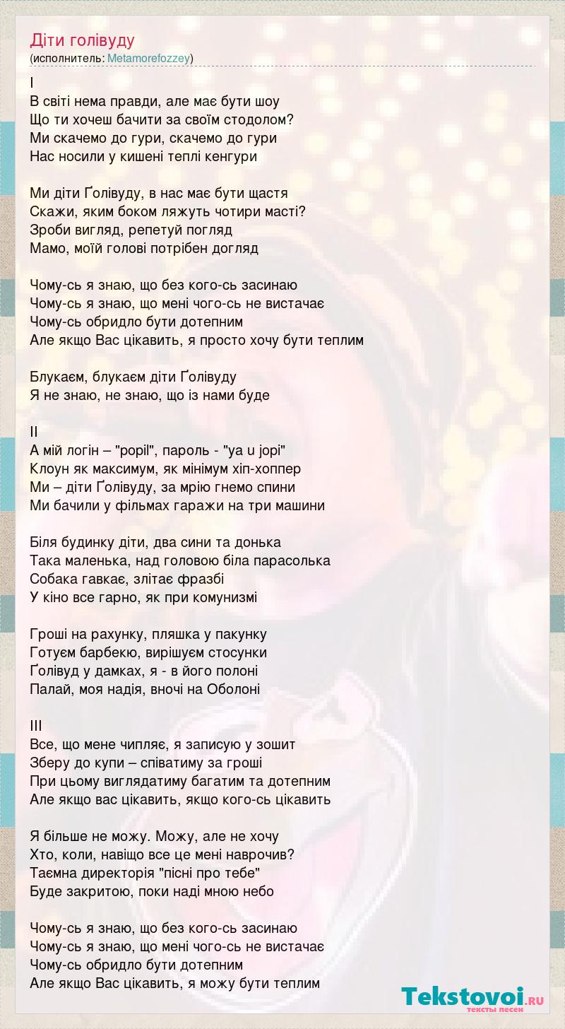 I В світі нема правди, але має бути шоу Що ти хочеш бачити за своїм стодолом? Ми скачемо до гури, скачемо до гури Нас носили у кишені теплі кенгури Ми діти Ґолівуду, в нас має бути щастя Скажи, яким боком ляжуть чотири масті? Зроби вигляд, репетуй погляд Мамо, моїй голові потрібен догляд Чому-сь я знаю, що без кого-сь засинаю Чому-сь я знаю, що мені чого-сь не вистачає Чому-сь обридло бути дотепним Але якщо Вас цікавить, я просто хочу бути теплим Блукаєм, блукаєм діти Ґолівуду Я не знаю, не знаю, що із нами буде II А мій логін – "popil", пароль - "ya u jopi" Клоун як максимум, як мінімум хіп-хоппер Ми – діти Ґолівуду, за мрію гнемо спини Ми бачили у фільмах гаражи на три машини Біля будинку діти, два сини та донька Така маленька, над головою біла парасолька Собака гавкає, злітає фразбі У кіно все гарно, як при комунизмі Гроші на рахунку, пляшка у пакунку Готуєм барбекю, вирішуєм стосунки Ґолівуд у дамках, я - в його полоні Палай, моя надія, вночі на Оболоні III Все, що мене чипляє, я записую у зошит Зберу до купи – співатиму за гроші При цьому виглядатиму багатим та дотепним Але якщо вас цікавить, якщо кого-сь цікавить Я більше не можу. Можу, але не хочу Хто, коли, навіщо все це мені наврочив? Таємна директорія "пісні про тебе" Буде закритою, поки наді мною небо Чому-сь я знаю, що без кого-сь засинаю Чому-сь я знаю, що мені чого-сь не вистачає Чому-сь обридло бути дотепним Але якщо Вас цікавить, я можу бути теплим