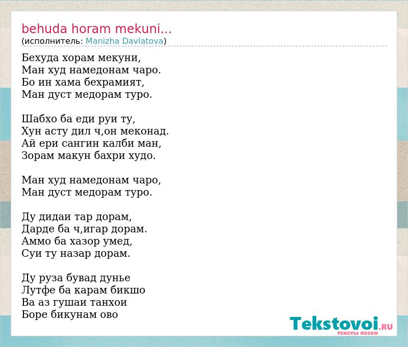 Бехуда хорам мекуни, Ман худ намедонам чаро. Бо ин хама бехрамият, Ман дуст медорам туро. Шабхо ба еди руи ту, Хун асту дил ч,он меконад. Ай ери сангин калби ман, Зорам макун бахри худо. Ман худ намедонам чаро, Ман дуст медорам туро. Ду дидаи тар дорам, Дарде ба ч,игар дорам. Аммо ба хазор умед, Суи ту назар дорам. Ду руза бувад дунье Лутфе ба карам бикшо Ва аз гушаи танхои Боре бикунам ово