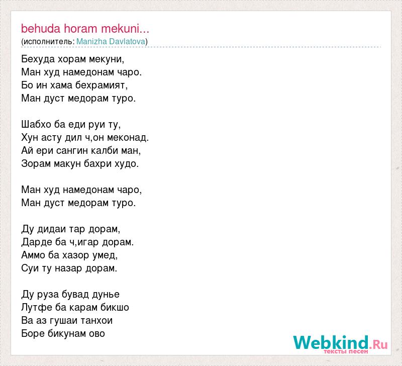 Бехуда хорам мекуни, Ман худ намедонам чаро. Бо ин хама бехрамият, Ман дуст медорам туро. Шабхо ба еди руи ту, Хун асту дил ч,он меконад. Ай ери сангин калби ман, Зорам макун бахри худо. Ман худ намедонам чаро, Ман дуст медорам туро. Ду дидаи тар дорам, Дарде ба ч,игар дорам. Аммо ба хазор умед, Суи ту назар дорам. Ду руза бувад дунье Лутфе ба карам бикшо Ва аз гушаи танхои Боре бикунам ово