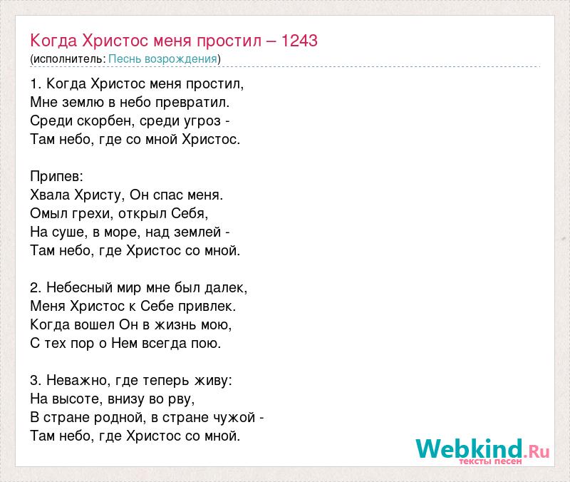1. Когда Христос меня простил, Мне землю в небо превратил. Среди скорбен, среди угроз - Там небо, где со мной Христос. Припев: Хвала Христу, Он спас меня. Омыл грехи, открыл Себя, На суше, в море, над землей - Там небо, где Христос со мной. 2. Небесный мир мне был далек, Меня Христос к Себе привлек. Когда вошел Он в жизнь мою, С тех пор о Нем всегда пою. 3. Неважно, где теперь живу: На высоте, внизу во рву, В стране родной, в стране чужой - Там небо, где Христос со мной.