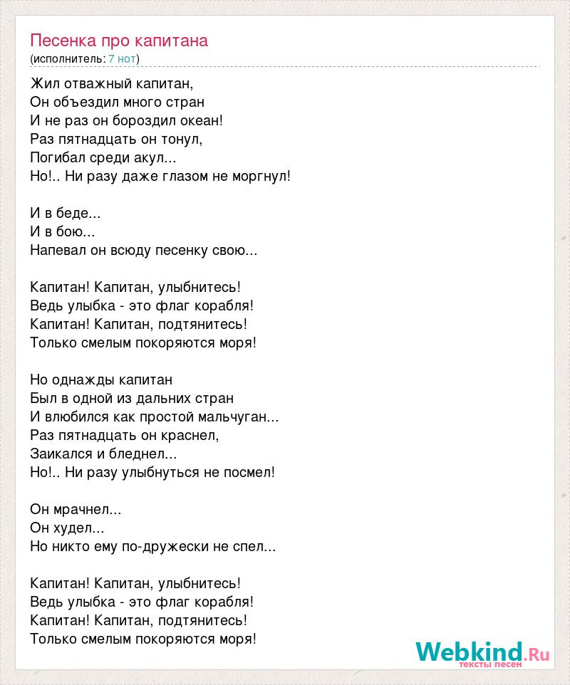 Жил отважный капитан, Он объездил много стран И не раз он бороздил океан! Раз пятнадцать он тонул, Погибал среди акул... Но!.. Ни разу даже глазом не моргнул! И в беде... И в бою... Напевал он всюду песенку свою... Капитан! Капитан, улыбнитесь! Ведь улыбка - это флаг корабля! Капитан! Капитан, подтянитесь! Только смелым покоряются моря! Но однажды капитан Был в одной из дальних стран И влюбился как простой мальчуган... Раз пятнадцать он краснел, Заикался и бледнел... Но!.. Ни разу улыбнуться не посмел! Он мрачнел... Он худел... Но никто ему по-дружески не спел... Капитан! Капитан, улыбнитесь! Ведь улыбка - это флаг корабля! Капитан! Капитан, подтянитесь! Только смелым покоряются моря!