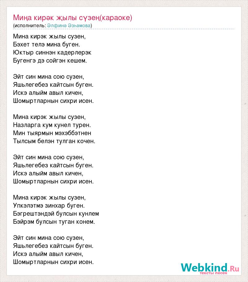 Мина кирэк жылы сузен, Бэхет телэ мина буген. Юктыр синнэн кадерлерэк Бугенгэ дэ сойгэн кешем. Эйт син мина сою сузен, Яшьлегебез кайтсын буген. Искэ алыйм авыл кичен, Шомыртларнын сихри исен. Мина кирэк жылы сузен, Назларга кум кунел турен. Мин тыярмын мэхэббэтнен Тылсым белэн тулган кочен. Эйт син мина сою сузен, Яшьлегебез кайтсын буген. Искэ алыйм авыл кичен, Шомыртларнын сихри исен. Мина кирэк жылы сузен, Упкэлэтмэ зинхар буген. Бэгрештэндэй булсын кунлем Бэйрэм булсын туган конем. Эйт син мина сою сузен, Яшьлегебез кайтсын буген. Искэ алыйм авыл кичен, Шомыртларнын сихри исен.