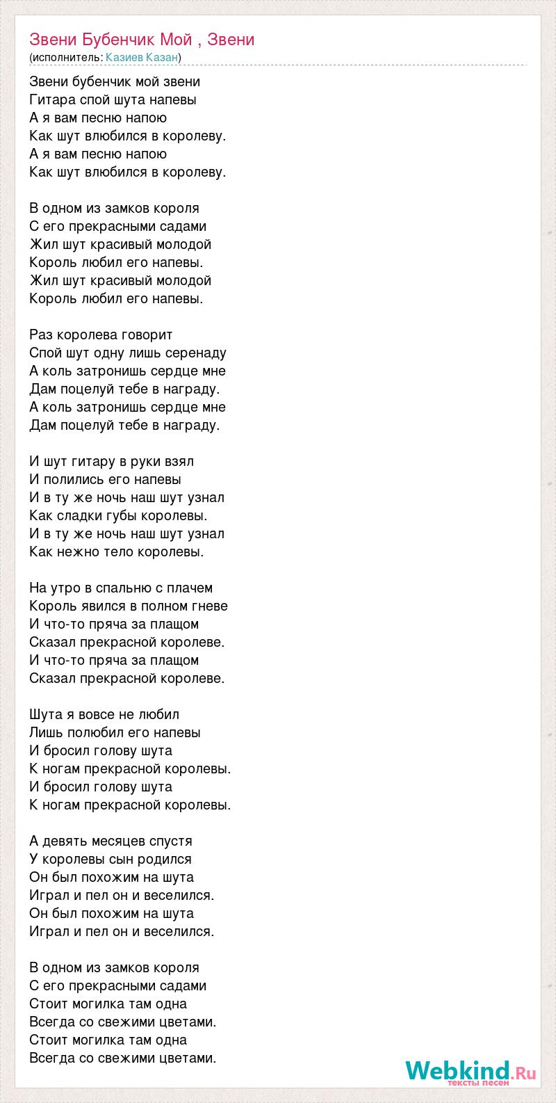Звени бубенчик мой звени Гитара спой шута напевы А я вам песню напою Как шут влюбился в королеву. А я вам песню напою Как шут влюбился в королеву. В одном из замков короля С его прекрасными садами Жил шут красивый молодой Король любил его напевы. Жил шут красивый молодой Король любил его напевы. Раз королева говорит Спой шут одну лишь серенаду А коль затронишь сердце мне Дам поцелуй тебе в награду. А коль затронишь сердце мне Дам поцелуй тебе в награду. И шут гитару в руки взял И полились его напевы И в ту же ночь наш шут узнал Как сладки губы королевы. И в ту же ночь наш шут узнал Как нежно тело королевы. Hа утро в спальню с плачем Король явился в полном гневе И что-то пряча за плащом Сказал прекрасной королеве. И что-то пряча за плащом Сказал прекрасной королеве. Шута я вовсе не любил Лишь полюбил его напевы И бросил голову шута К ногам прекрасной королевы. И бросил голову шута К ногам прекрасной королевы. А девять месяцев спустя У королевы сын родился Он был похожим на шута Играл и пел он и веселился. Он был похожим на шута Играл и пел он и веселился. В одном из замков короля С его прекрасными садами Стоит могилка там одна Всегда со свежими цветами. Стоит могилка там одна Всегда со свежими цветами.