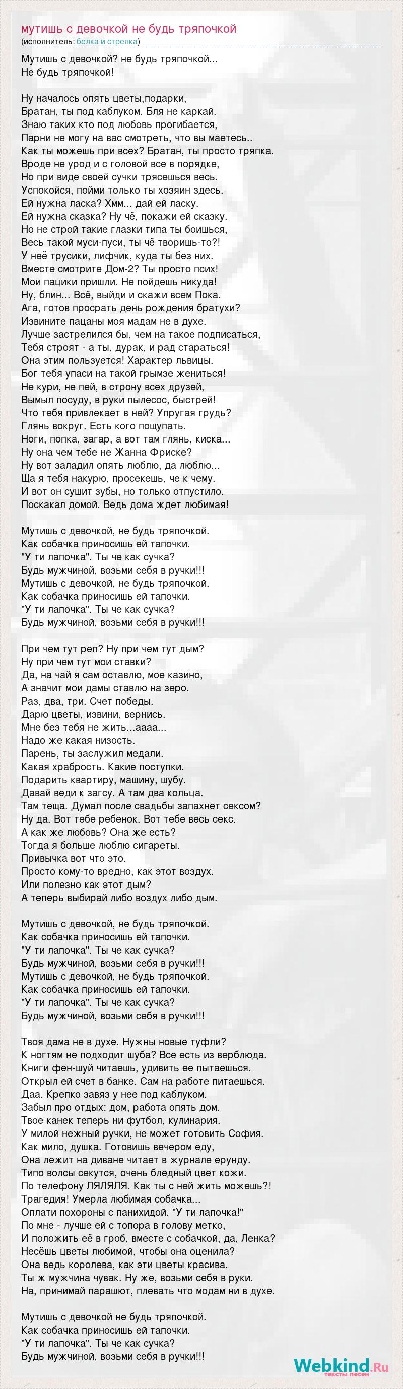 Мутишь с девочкой? не будь тряпочкой... Не будь тряпочкой! Ну началось опять цветы,подарки, Братан, ты под каблуком. Бля не каркай. Знаю таких кто под любовь прогибается, Парни не могу на вас смотреть, что вы маетесь.. Как ты можешь при всех? Братан, ты просто тряпка. Вроде не урод и с головой все в порядке, Но при виде своей сучки трясешься весь. Успокойся, пойми только ты хозяин здесь. Ей нужна ласка? Хмм... дай ей ласку. Ей нужна сказка? Ну чё, покажи ей сказку. Но не строй такие глазки типа ты боишься, Весь такой муси-пуси, ты чё творишь-то?! У неё трусики, лифчик, куда ты без них. Вместе смотрите Дом-2? Ты просто псих! Мои пацики пришли. Не пойдешь никуда! Ну, блин... Всё, выйди и скажи всем Пока. Ага, готов просрать день рождения братухи? Извините пацаны моя мадам не в духе. Лучше застрелился бы, чем на такое подписаться, Тебя строят - а ты, дурак, и рад стараться! Она этим пользуется! Характер львицы. Бог тебя упаси на такой грымзе жениться! Не кури, не пей, в строну всех друзей, Вымыл посуду, в руки пылесос, быстрей! Что тебя привлекает в ней? Упругая грудь? Глянь вокруг. Есть кого пощупать. Ноги, попка, загар, а вот там глянь, киска... Ну она чем тебе не Жанна Фриске? Ну вот заладил опять люблю, да люблю... Ща я тебя накурю, просекешь, че к чему. И вот он сушит зубы, но только отпустило. Поскакал домой. Ведь дома ждет любимая! Мутишь с девочкой, не будь тряпочкой. Как собачка приносишь ей тапочки. "У ти лапочка". Ты че как сучка? Будь мужчиной, возьми себя в ручки!!! Мутишь с девочкой, не будь тряпочкой. Как собачка приносишь ей тапочки. "У ти лапочка". Ты че как сучка? Будь мужчиной, возьми себя в ручки!!! При чем тут реп? Ну при чем тут дым? Ну при чем тут мои ставки? Да, на чай я сам оставлю, мое казино, А значит мои дамы ставлю на зеро. Раз, два, три. Счет победы. Дарю цветы, извини, вернись. Мне без тебя не жить...аааа... Надо же какая низость. Парень, ты заслужил медали. Какая храбрость. Какие поступки. Подарить квартиру, машину, шубу. Давай веди к загсу. А там два кольца. Там теща. Думал после свадьбы запахнет сексом? Ну да. Вот тебе ребенок. Вот тебе весь секс. А как же любовь? Она же есть? Тогда я больше люблю сигареты. Привычка вот что это. Просто кому-то вредно, как этот воздух. Или полезно как этот дым? А теперь выбирай либо воздух либо дым. Мутишь с девочкой, не будь тряпочкой. Как собачка приносишь ей тапочки. "У ти лапочка". Ты че как сучка? Будь мужчиной, возьми себя в ручки!!! Мутишь с девочкой, не будь тряпочкой. Как собачка приносишь ей тапочки. "У ти лапочка". Ты че как сучка? Будь мужчиной, возьми себя в ручки!!! Твоя дама не в духе. Нужны новые туфли? К ногтям не подходит шуба? Все есть из верблюда. Книги фен-шуй читаешь, удивить ее пытаешься. Открыл ей счет в банке. Сам на работе питаешься. Даа. Крепко завяз у нее под каблуком. Забыл про отдых: дом, работа опять дом. Твое канек теперь ни футбол, кулинария. У милой нежный ручки, не может готовить София. Как мило, душка. Готовишь вечером еду, Она лежит на диване читает в журнале ерунду. Типо волсы секутся, очень бледный цвет кожи. По телефону ЛЯЛЯЛЯ. Как ты с ней жить можешь?! Трагедия! Умерла любимая собачка... Оплати похороны с панихидой. "У ти лапочка!" По мне - лучше ей с топора в голову метко, И положить её в гроб, вместе с собачкой, да, Ленка? Несёшь цветы любимой, чтобы она оценила? Она ведь королева, как эти цветы красива. Ты ж мужчина чувак. Ну же, возьми с